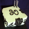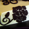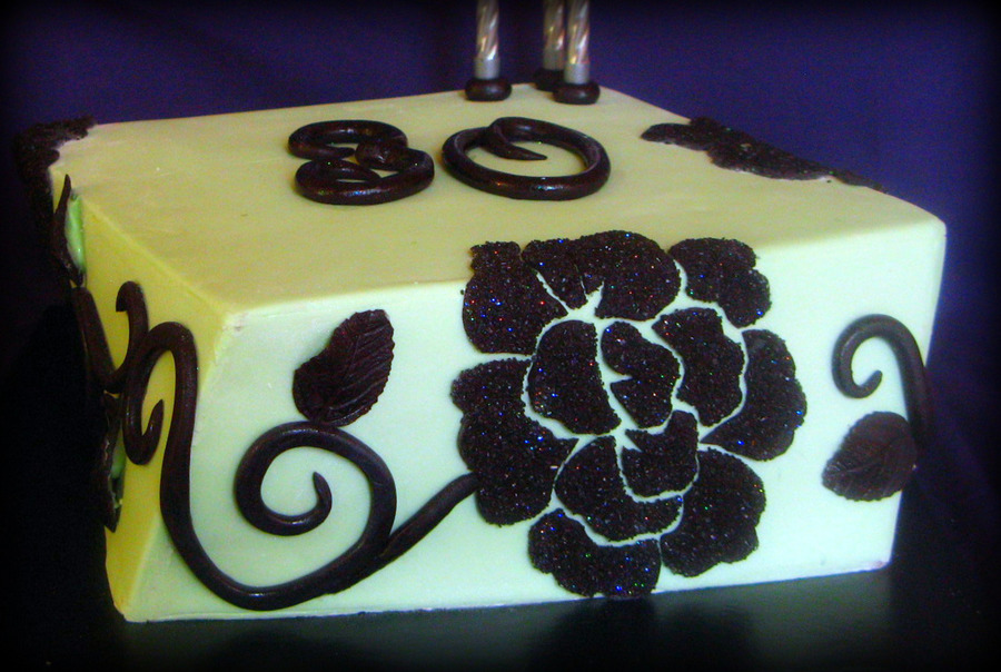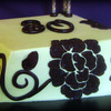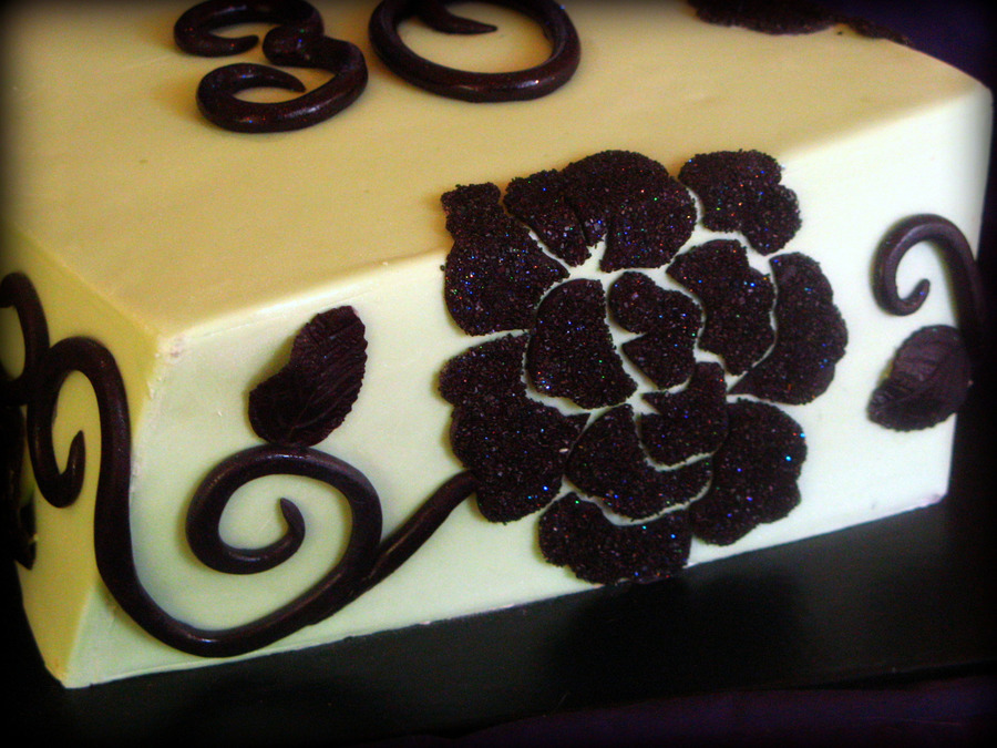 flowers are hand cut, finished in sparkly black sugar, and reconstructed on the cake with the gaps and interlocking. VERY TEDIOUS...but worth it. Inspired by designer wallpaper