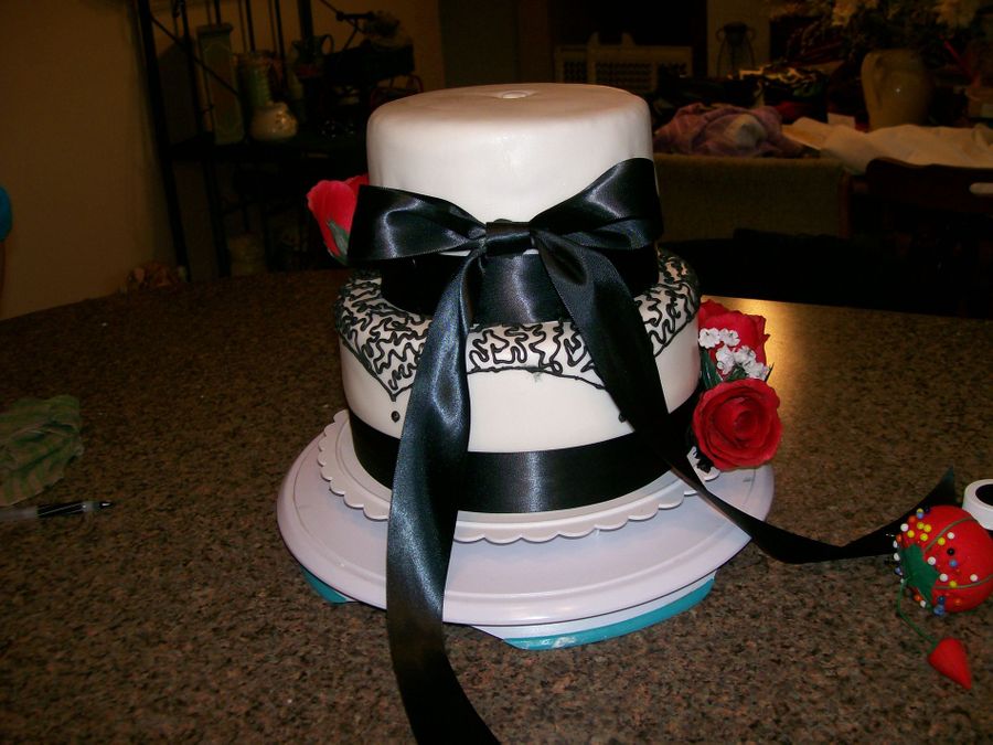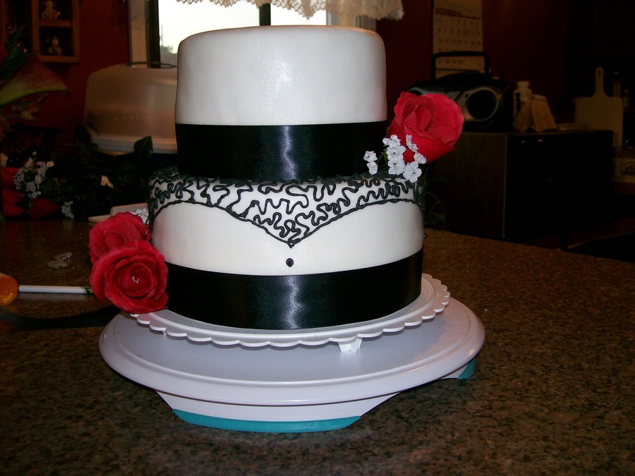 Made for my Aunt & Uncles 25th anniversary. The topper isn't on it yet. Top is devil's food with german chocolate filling, bottom is red velvet with cream cheese filling. Covered in MMF. Flowers are silk because I haven't learned how to do gumpaste flowers yet.