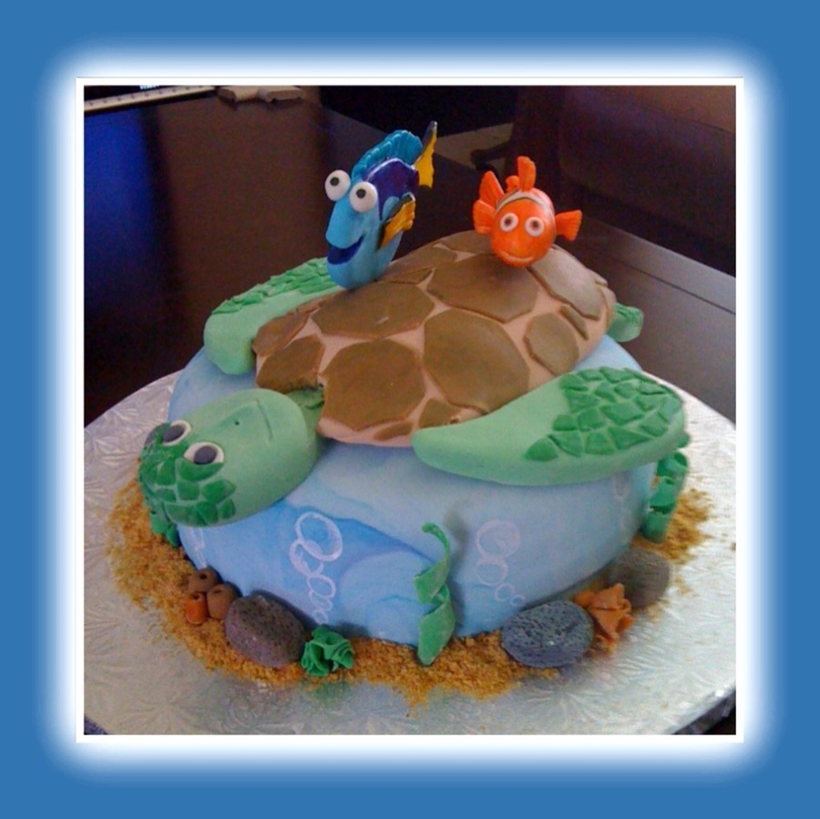 My nephew's birthday Nemo cake... the turtle's neck dried up and cracked a little (in the picture) but thankfully I was able to fix it before the party! absolutely everything is edible, all fondant. Vanilla on vanilla. This is my 2nd set of figures and the more I do the more I fall in love. thanks to many here on CC for inspiration with this cake. TFL