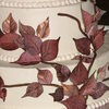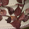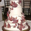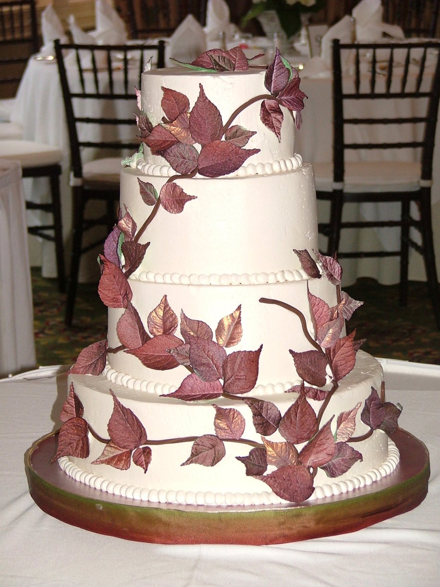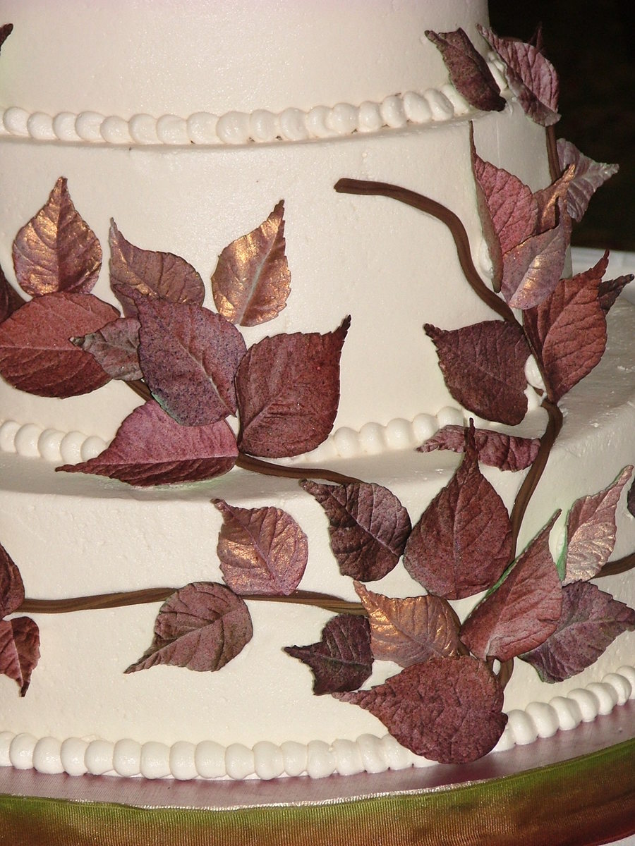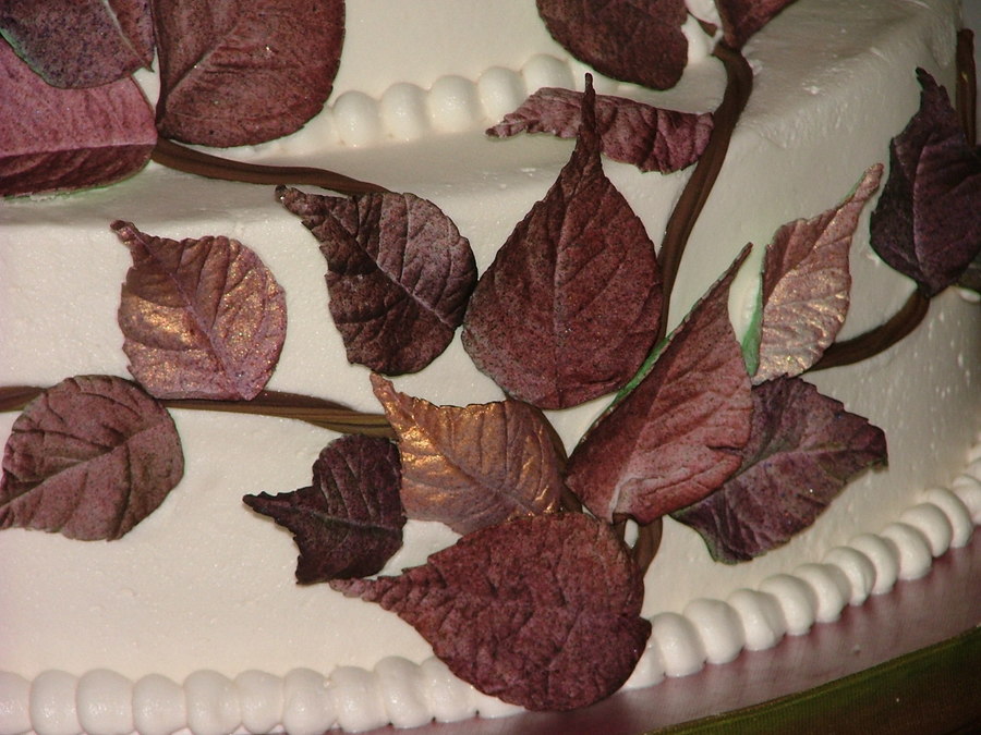 Gumpaste leaves began white. Airbrushed w a little green. Then purple, then red added to purple for a multi-hued, natural look. Some are oversprayed with antique gold for a coppery look over the burgundy. Branches are chocolate fondant thru extruder.