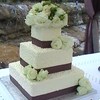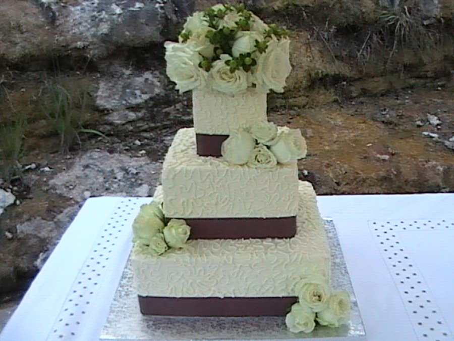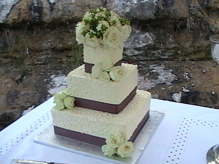 Pretty basic cake. Fr. Vanilla with buttercream. Correlli lace and a grey ribbon with real white roses.