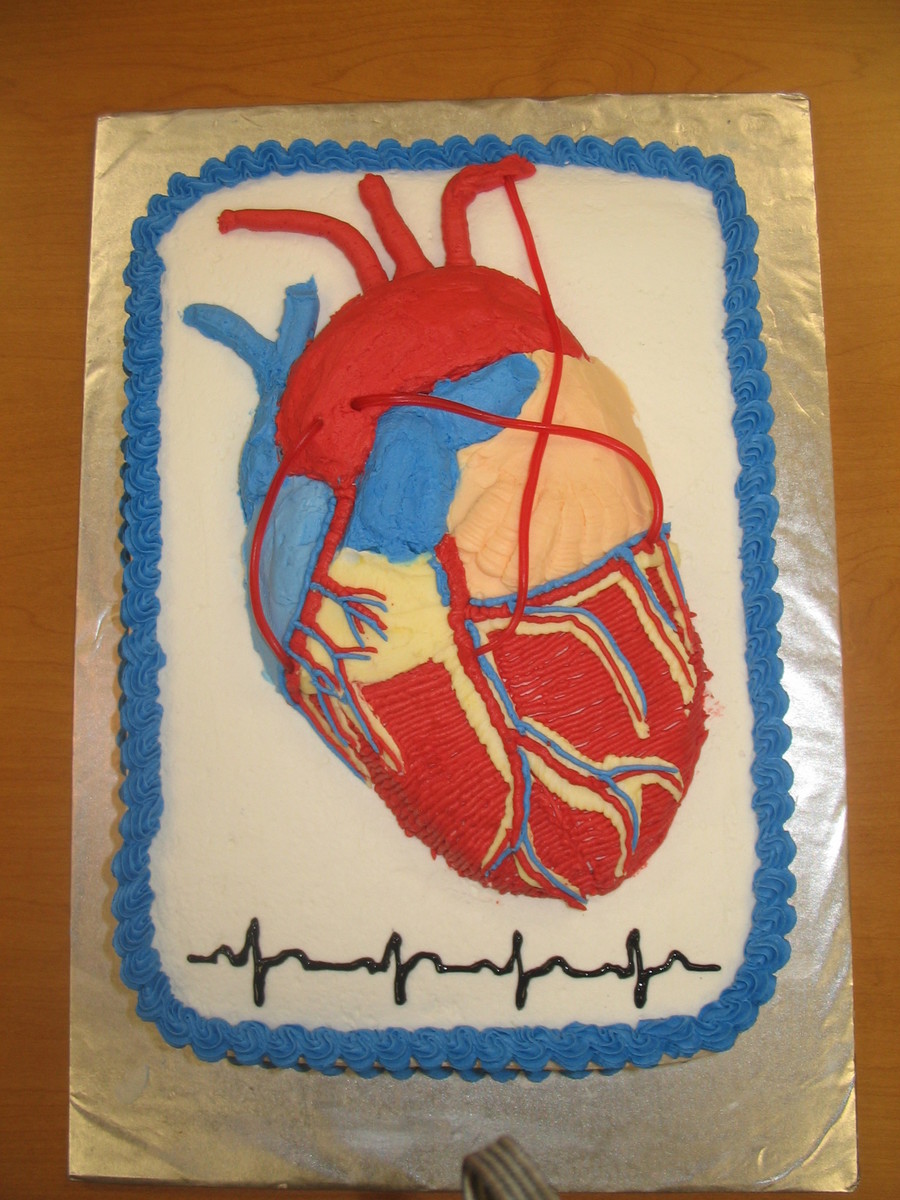 This was my first unusual theme cake, created for an open heart surgeon's birthday. When my coworkers asked for a "heart" cake, I snapped a picture of the heart model we use for teaching with my cell phone...the rest is history. This cake was (and still is) the talk of the hospital! Chocolate (the doc's fav.!) sponge cake with chocolate buttercream filling, buttercream icing for decorating, and red licorice "vein grafts".....Oh yeah, my daughters dog ate one layer of the cake @ 9p the night before, before I decorated it. Needless to say, it was a short night of sleep.