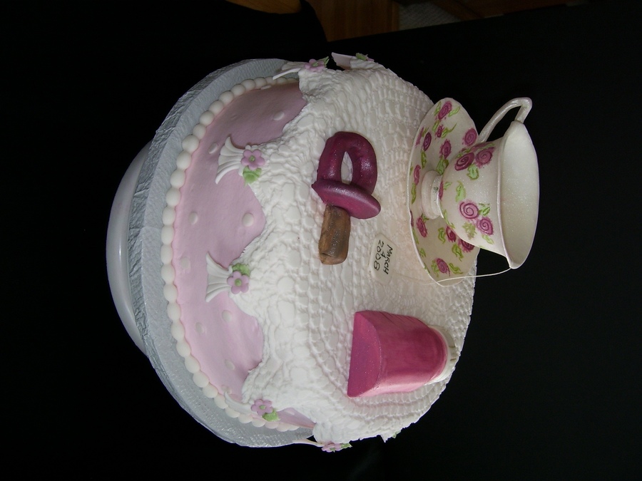 Tea cup is hand painted and made out of Gum Paste. The shower was given at our local Tea Shop. The mother to be loved tea. The date on the tea bag was the baby due date.