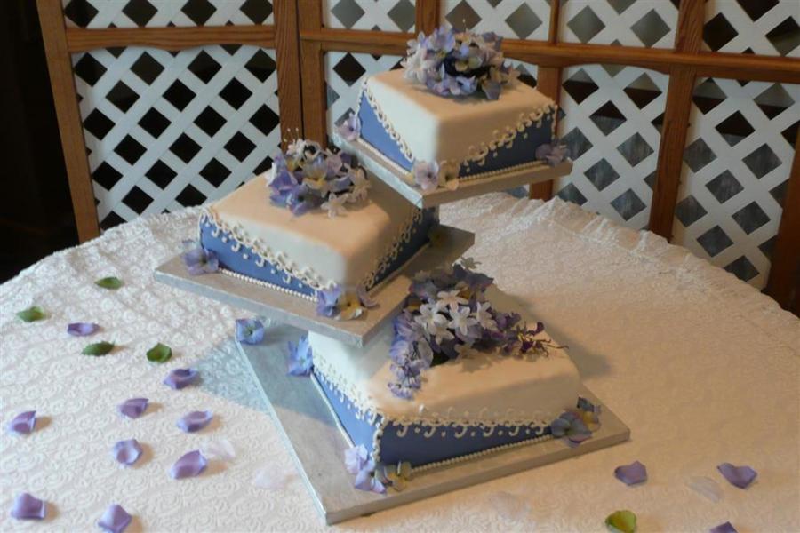 This was my first real fondant wedding cake...I did a cake dummy last year for the fair. The bride really liked the layout...thank you to Jennifer Dontz for the custom made stand...I had some trouble with the fondant on the bottom cake...it sucked right into the cake and had several marks from the cake...but I was able to cover that up with the hydrangeas...