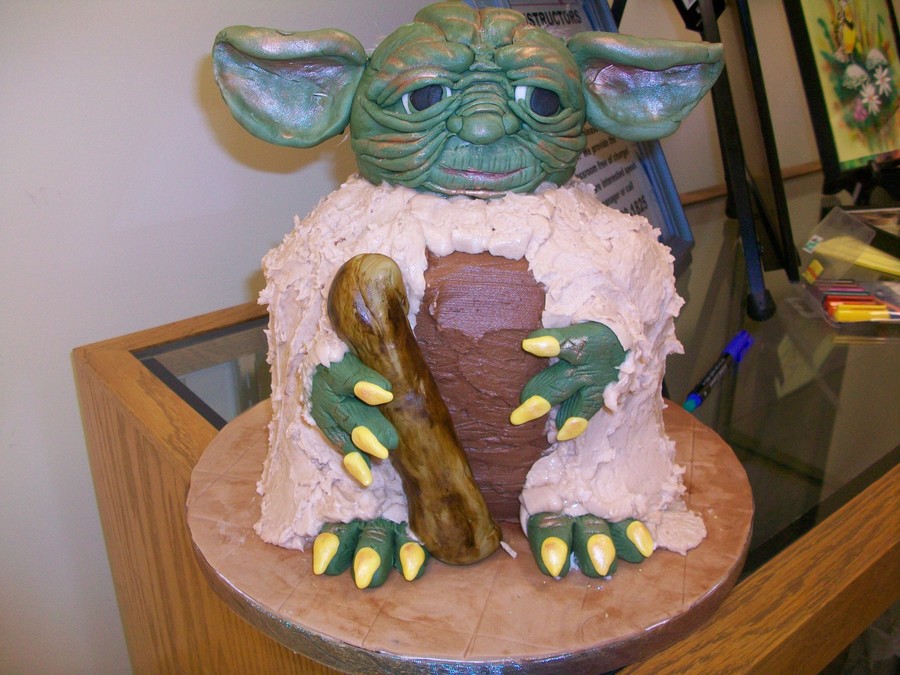 This is my 2nd Yoda. I didn't like him as much as my first one but once he was made, he was made. The people that ordered him, loved him, so that is all that matters. Right? His head is made from rice krispy treats and fondant. His body is cake and buttercream.