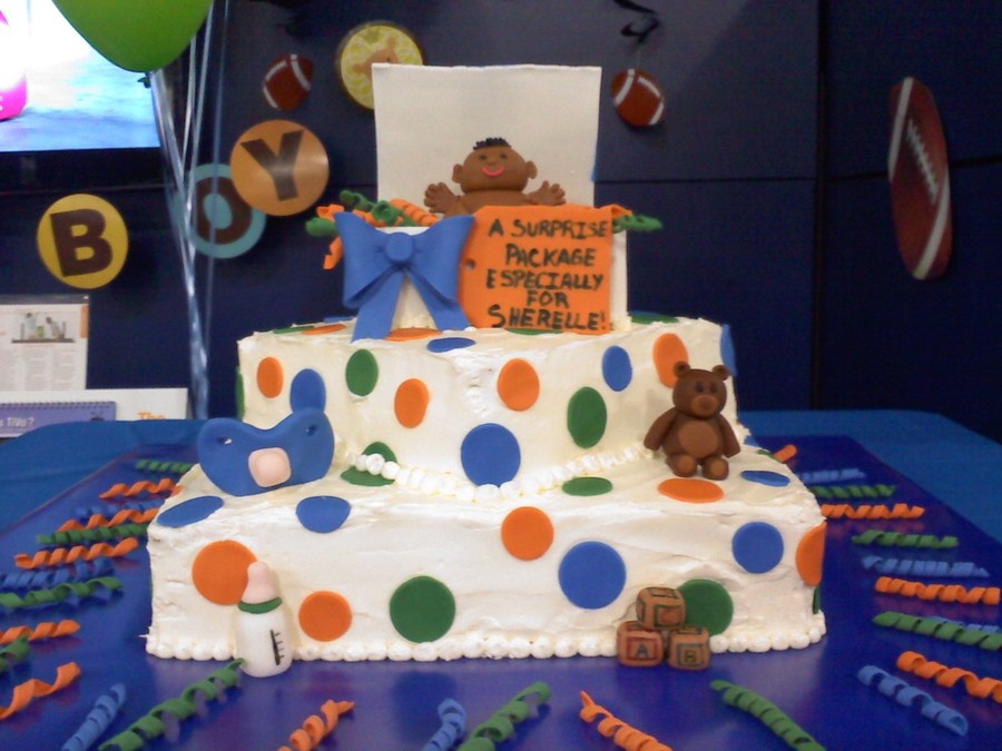 This baby shower cake is covered in butter cream fondant with all hand sculpted fondant decorations. THis was my first attempt at making fondant figures and I am pretty proud of it.