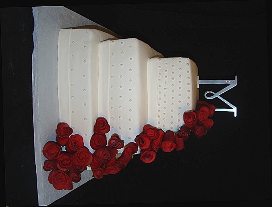 Double layer 14" square bottom, double layer 10" square middle, and double layer 6" square top. Bottom cake was WASC with raspberry buttercream filling, middle was marble cake with buttercream filling, and top was coconut cake with coconut buttercream filling. Covered in MMF and pearls. Roses are gumpaste, topper was provided.