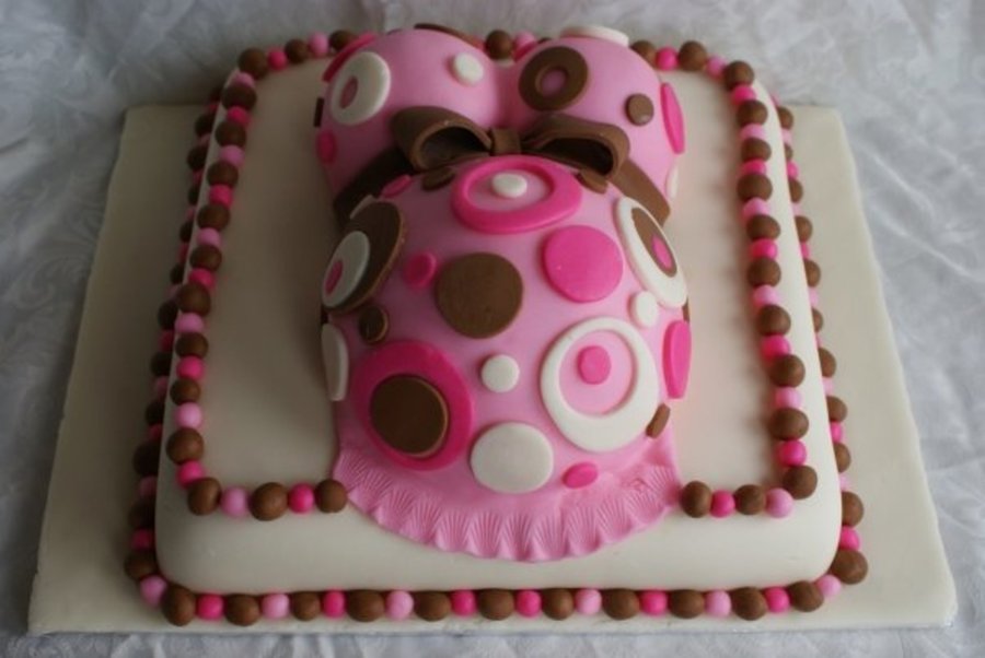 This is a baby shower cake for a woman expecting a baby girl. The baby's room is decorated in brown, pink and cream colored polka dots and the customer wanted similar. It is a 12 inch single layer base with the mommy torso made using the wonder mold and mini wonder mold pans. It is covered with vanilla butter cream and home made fondant icings. The Mommy to be was so surprised and delighted at the surprise cake. :) September, 2009