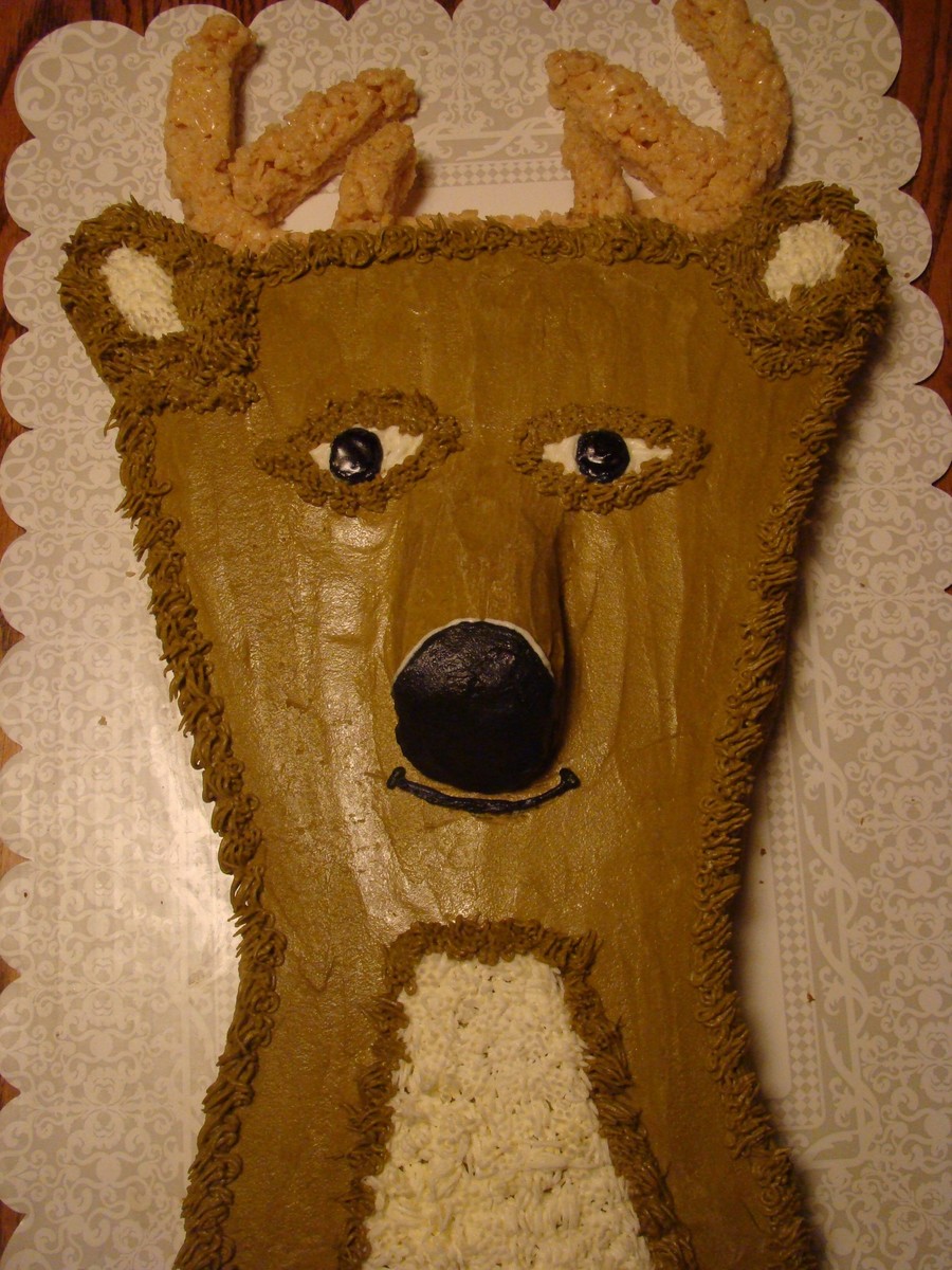 This cake was alot of fun....made for a friends 8 year old son who loves to deer hunt! All edible, buttercream and rice crispy treats for the horns.