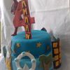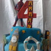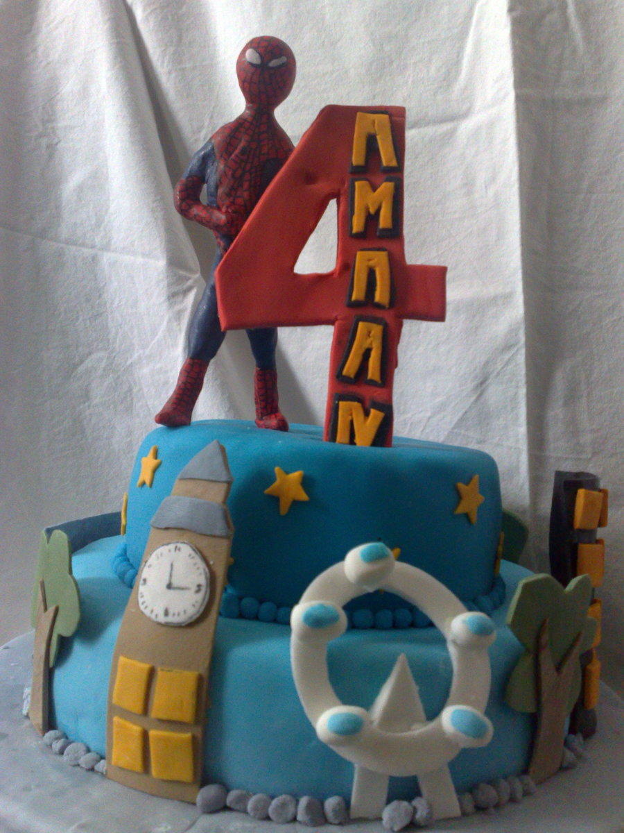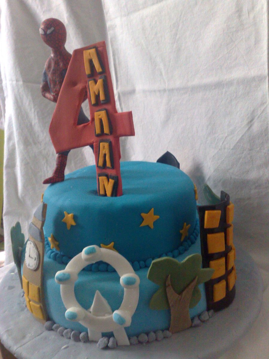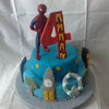 two teired birthday cake for a four year old who loves spiderman. Spiderman is made out of polymer clay and baked in the oven. the rest of the decoration are made from tylose added to sugarpaste. two lessons learnt from making this cake, always make your decorations in few days advence to alway it to harden and make sure the cake isn't too soft so the decoraions dont sink in to it.