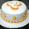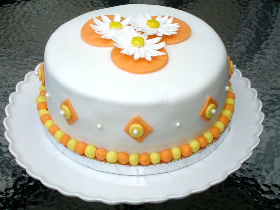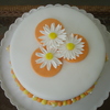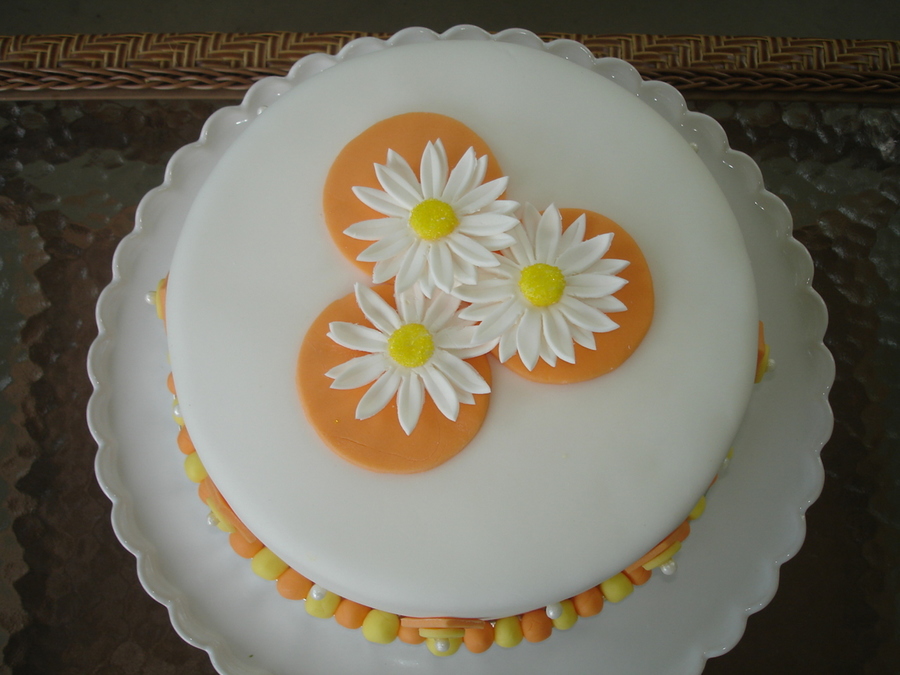 I did this cake a while back for a book club get together. The daisies are made of gumpaste; the other accents are made of fondant and highlighted with edible pearls. This cake was classic white with a lemon buttercream filling.