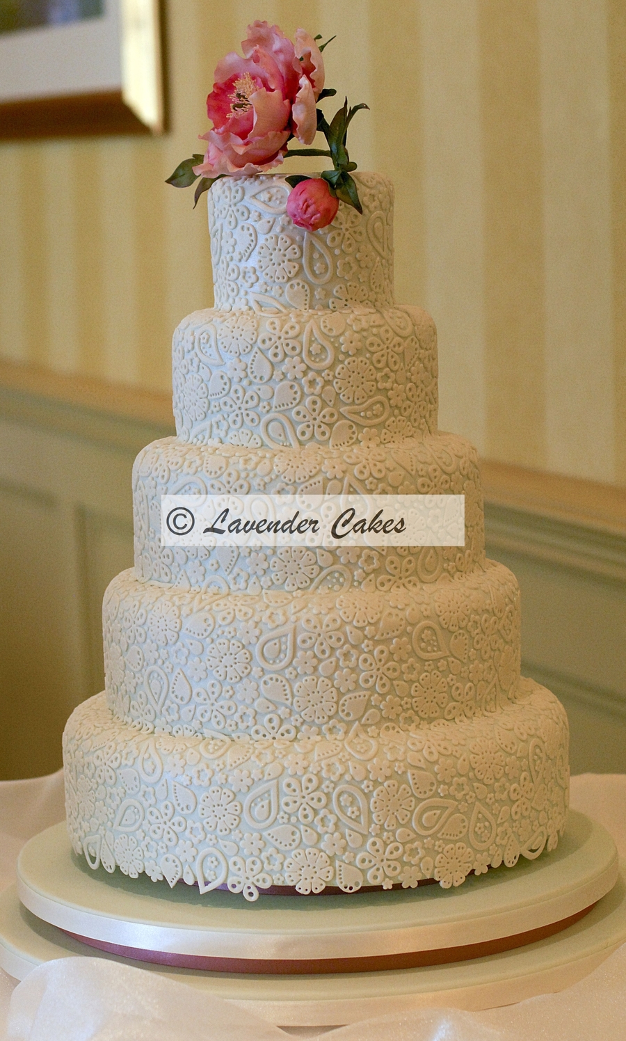 This is the cake I designed and created for my wedding on the 4th July this year. It is covered in individually cut out pieces of modelling paste and topped with a hand made sugar peony.