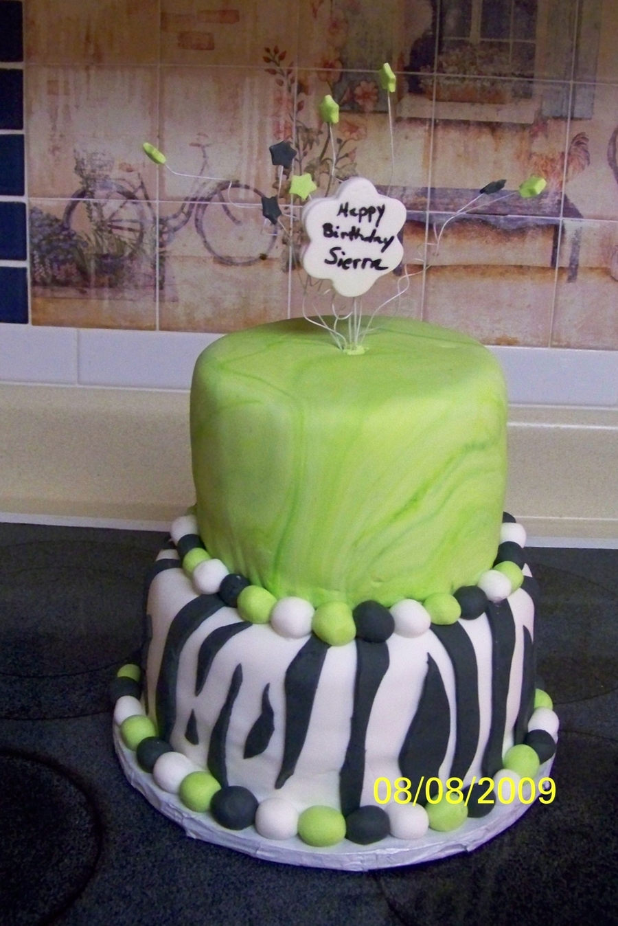 Bottom tier chocolate fudge cake w/vanilla buttercream and fondant covering and fondant zebra stripes. Top tier white cake w/vanilla buttercream and marble fondant covering with fondant/tylose mixture for stars and name plaque.