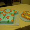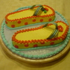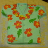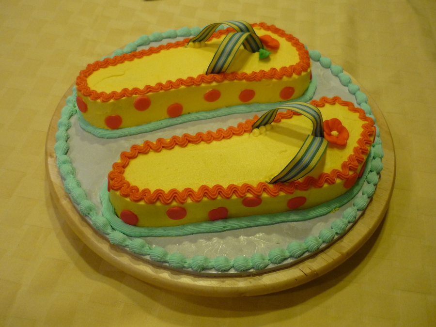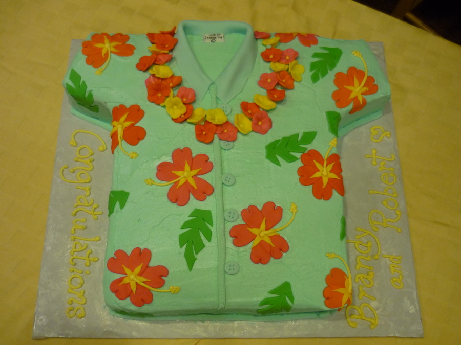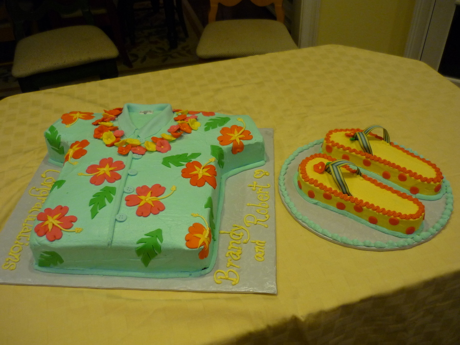 For a luau themed wedding shower. Hawaiian shirt and flip flops all buttercream with fondant hibiscus flowers and palm leaves, dots. Lei flowers formed from fondant. Couples' last name is on the shirt label.