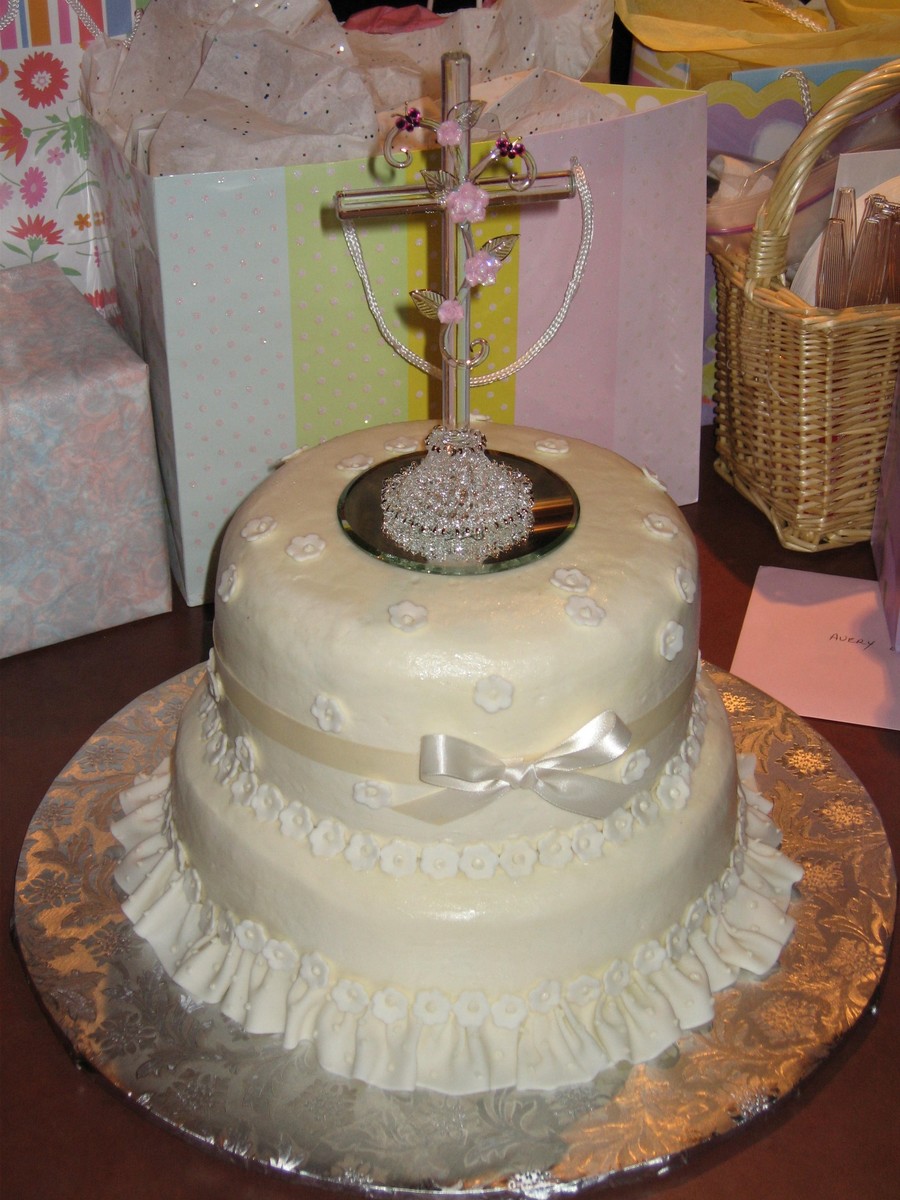 All buttercream except for sugar paste flowers & pearls and crystal cross.