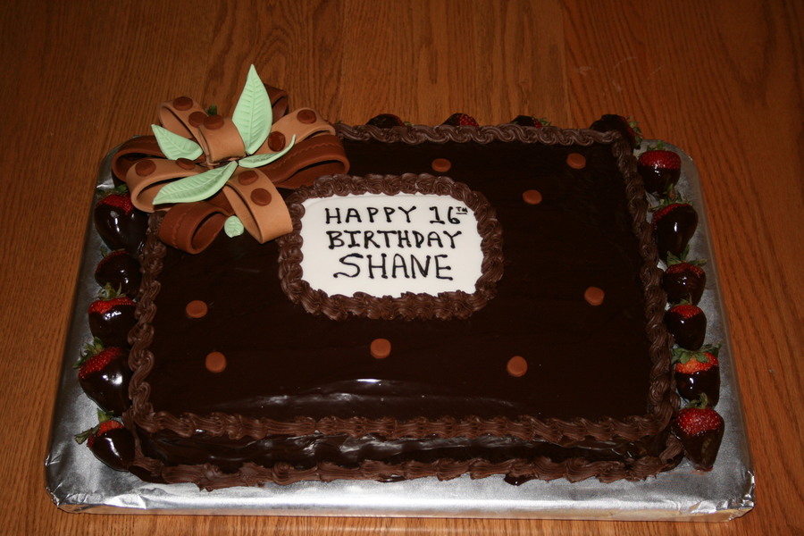 Made this for my nephew. White cake with choc ganche covering with fondant bow. Choc Dipped strawberries with ganache. Next time I will drizzle white ganache over strawberries.