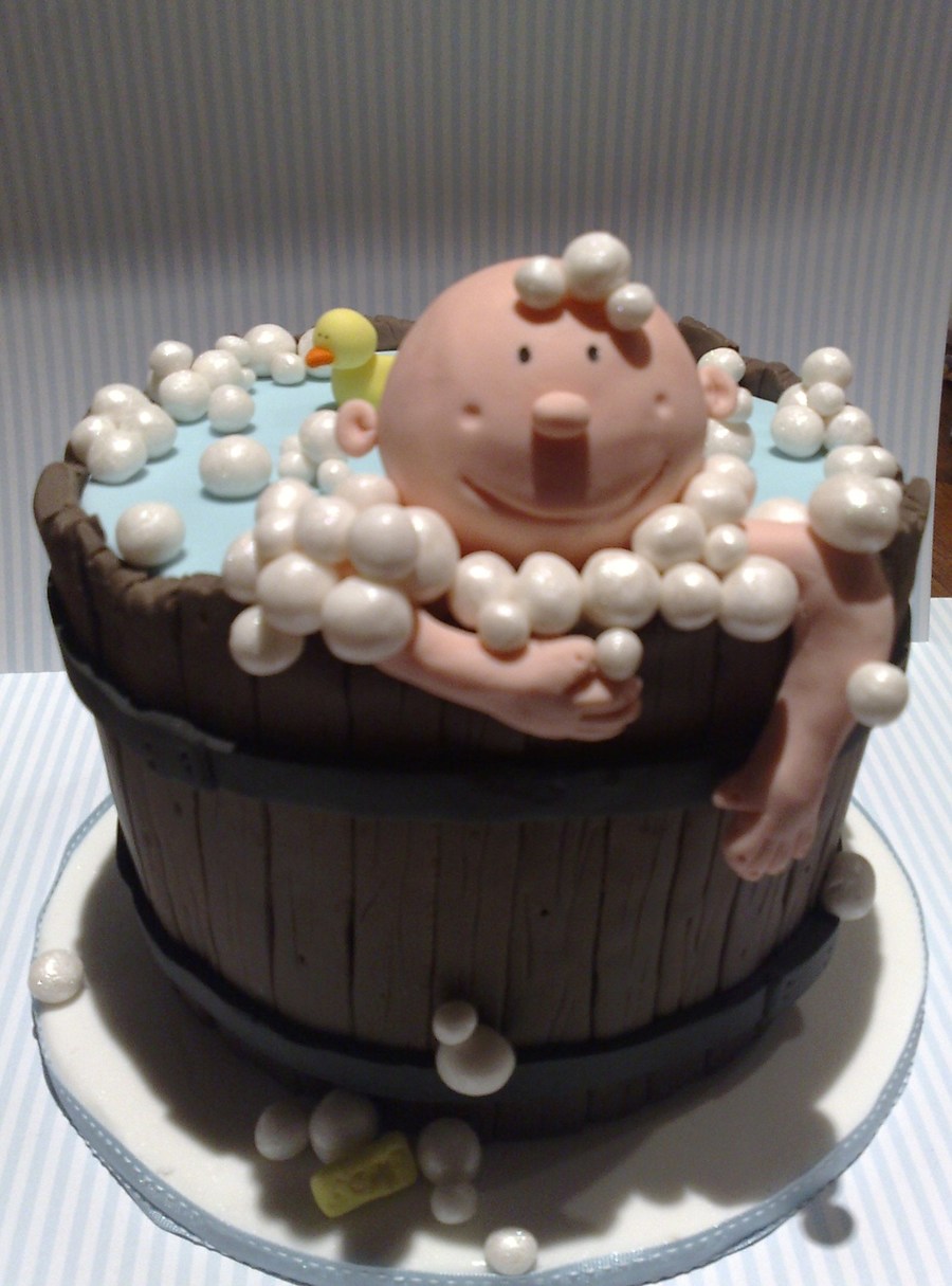 A layered Mars Bar mud cake with ganache and fondant. All edible bar the baby's head which was polystyrene.