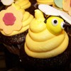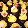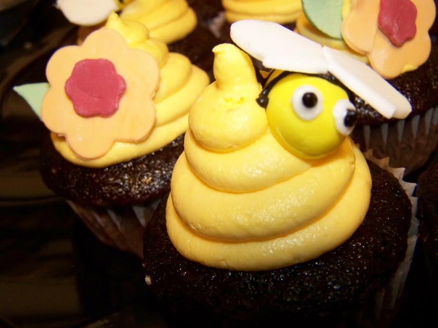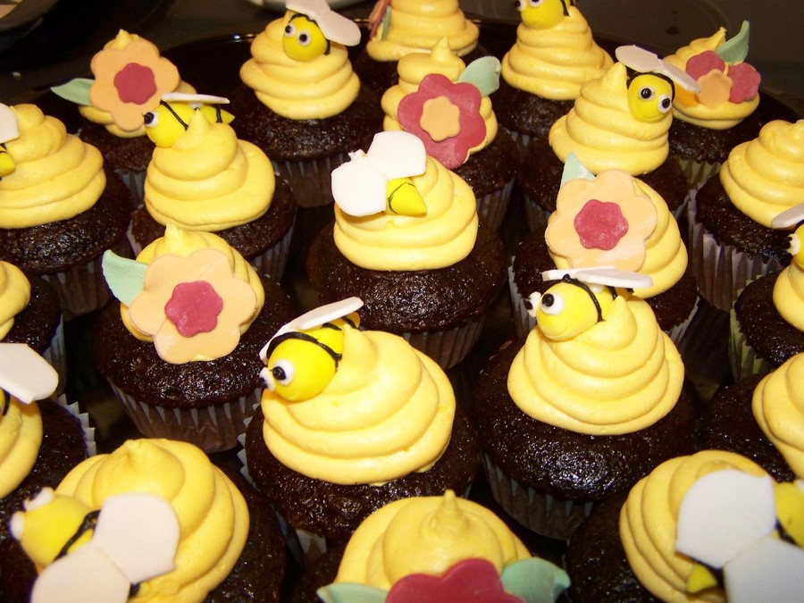 I made these for a co-workers 5 Y/O DD soccer team the "honey bees". Milk chocolate cupcakes with vanilla buttercream hives and fondant accents. I placed a hershey kiss on top of the cuppie to help support the hive