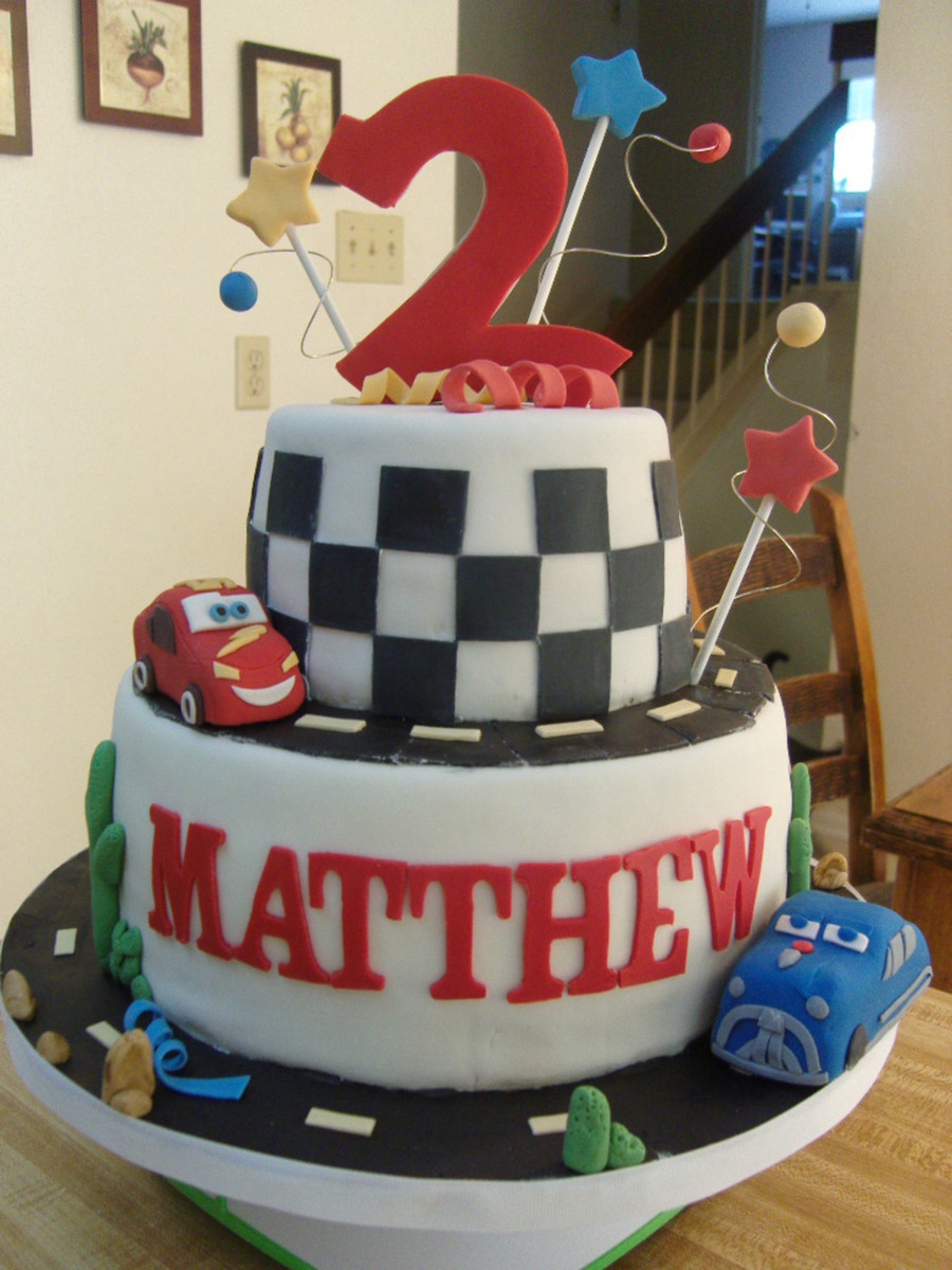 Vanilla cake, strawberry filling, mmf fondant. Cars are made of styrofoam and mmf fondant. Thanks for looking! :)