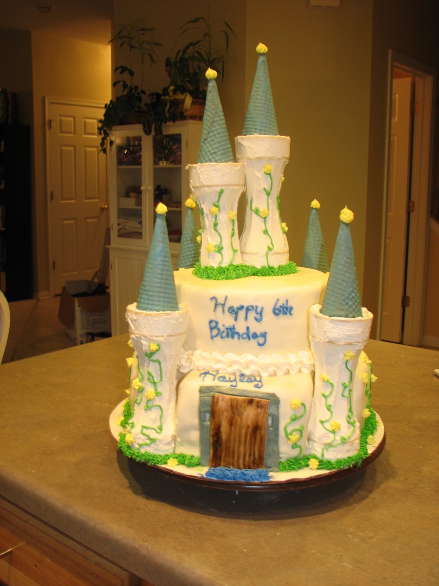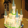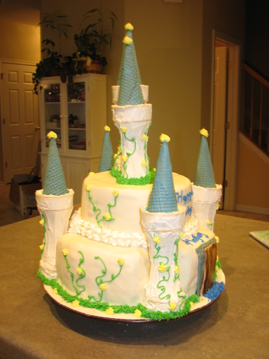 My first attempt at a castle cake. Towers and turrets are ice cream cones covered in BC. Cakes are covered in fondant. Cakes are chocolate with chocolate mousse filling and white chocolate cake with white chocolate and raspberry filling.