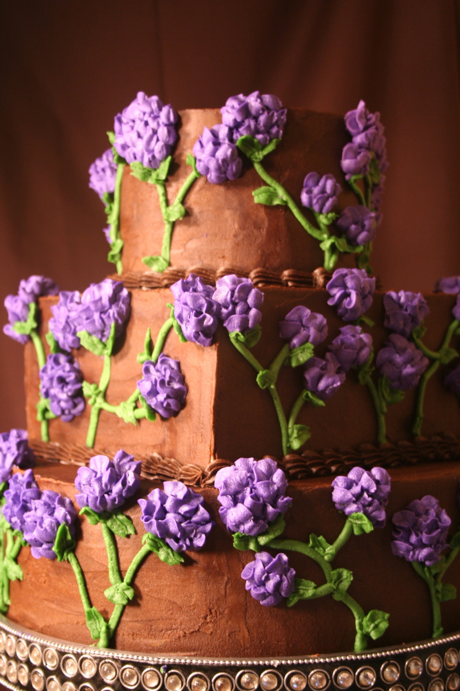 This is a last minute cake I decided to add to my wedding show table. Anyone have an opinion on what to call these flowers? Chocolate icing with purple flowers. round, square and round cakes. thanks for looking!