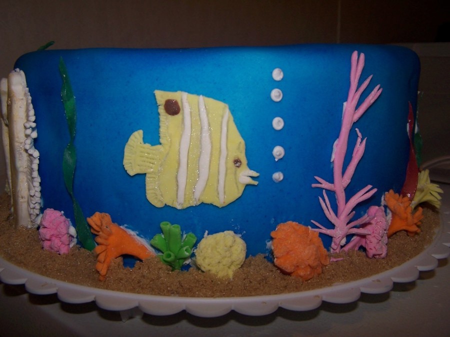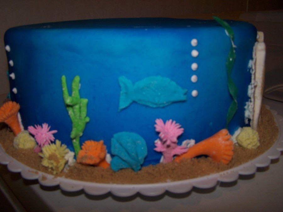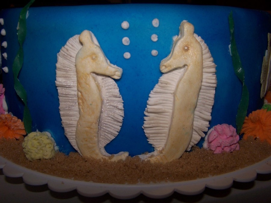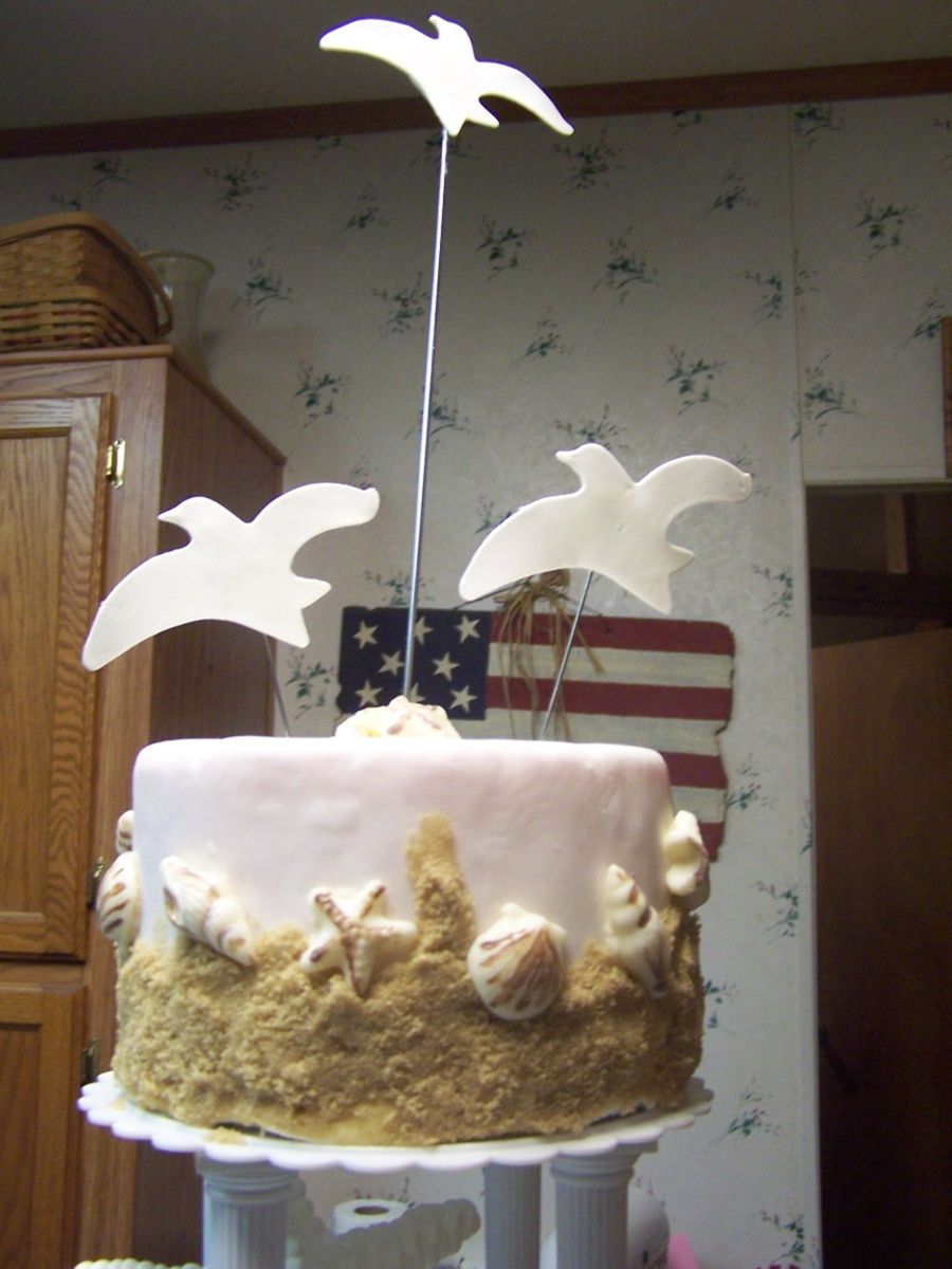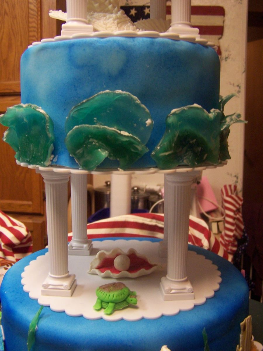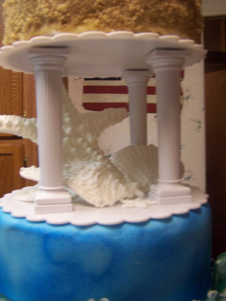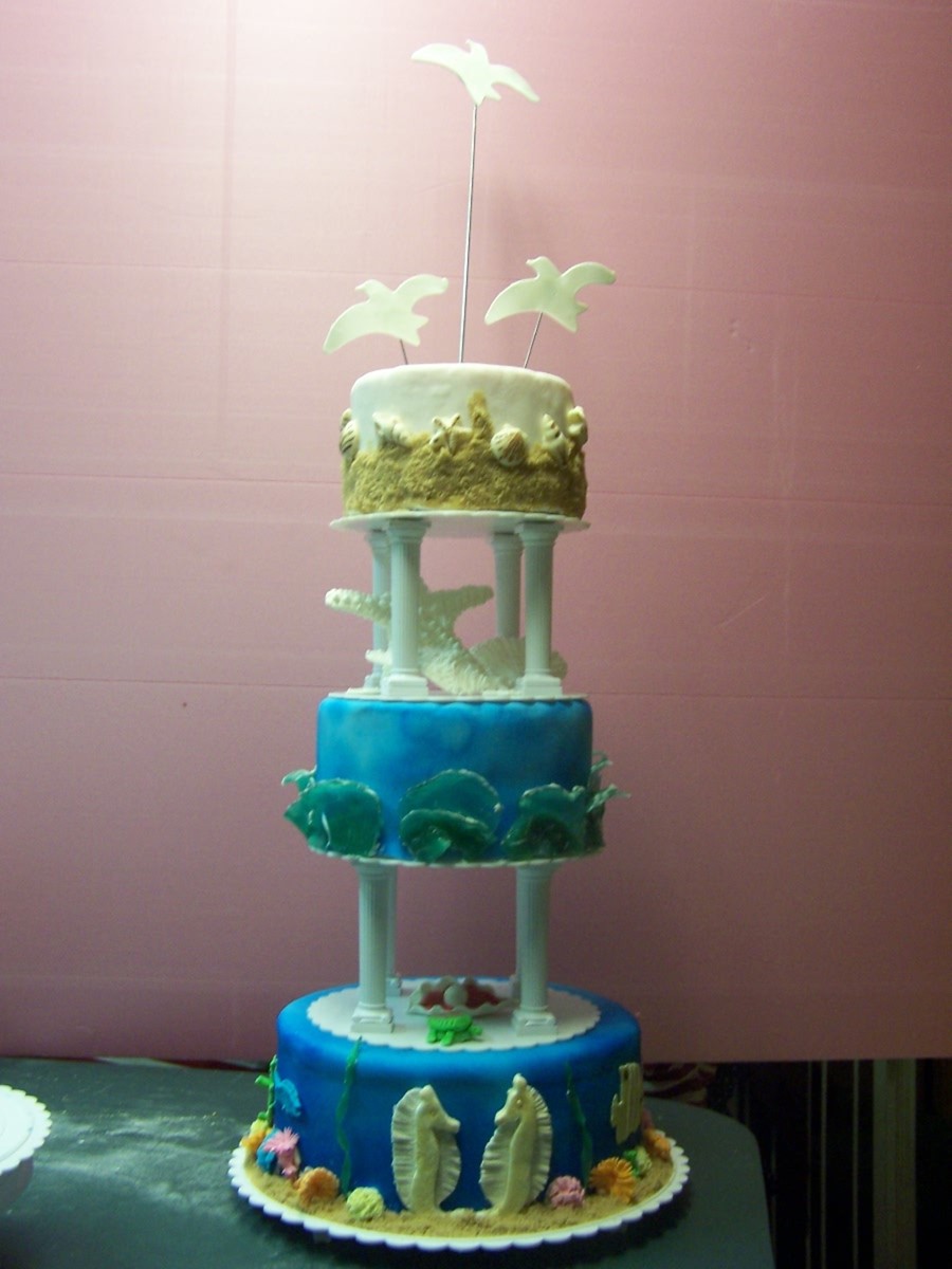 This is my first pillar cake. Topping the cake are gumpaste seagulls flying over a fondant beach with brown sugar sand and molded chocolate starfish and seashells. Between the tiers are royal icing starfish and seashells. The second tier are the waves made from hard candy. Between the second tier is a gumpaste clam w/pearl and sea turtle. The last tier has gumpaste coral and fish. I used fruit by the foot for seaweed and gumpaste for some of the coral. This cake won me best in show at our county fair. Woo hoo!
