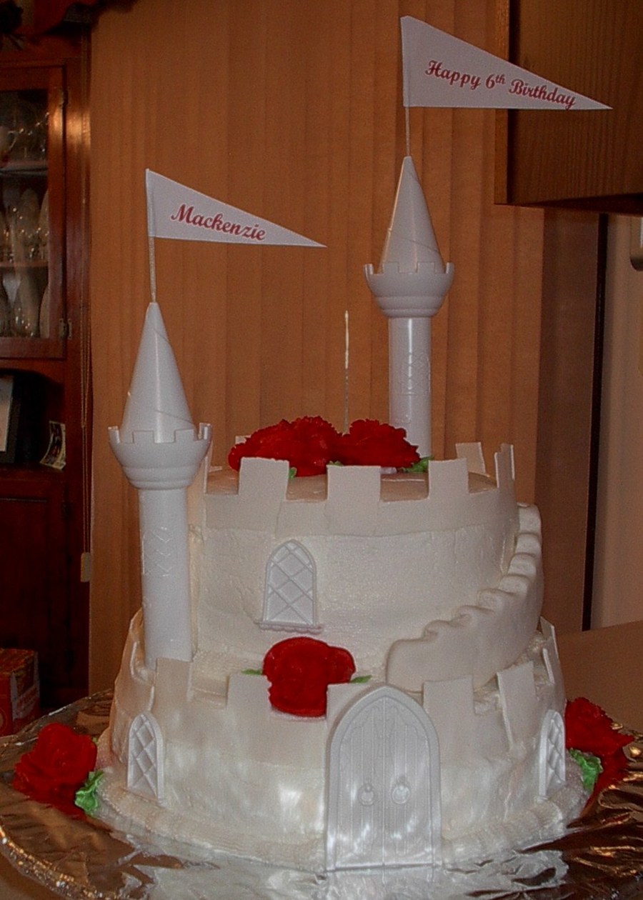Castle cake made for my daughter's boyfriend's little girl who just turned 6. She wanted an all white sand castle and picked this one. The only color she wanted was red roses. I used the Wilton Romantic Castle cake set. Thanks to all the CCers for their help in directions for the staircase. You guys rock!