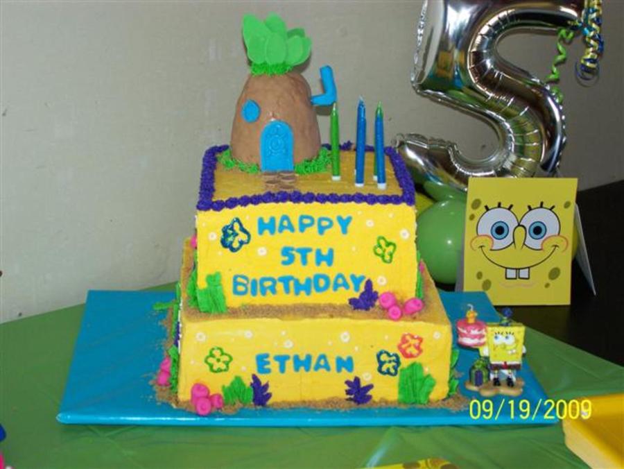 12" square and 8" square. Like alot of other Spong Bob cakes. I used Ideas from one cake and another here on CC. Thanks for all the ideas. wanted it stacked different, but the conners hung over if i turned the top tier. It needed to be 6",but all I could find was an 8".Still the birthday boy liked it and that's what matters. Pineapple house was rice crispy treat. I need some practice on that. Thanks for looking.