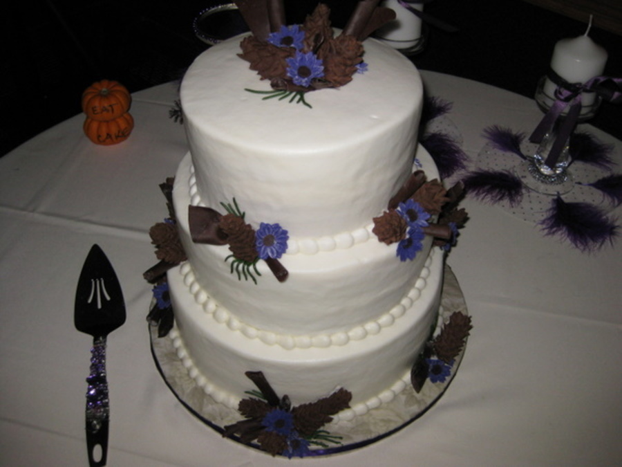 This I think is now one of my favorites. My friend brought in the picture of what she wanted. It had to have pine cones and chocolate curls. Pinecones were ok thanks to wonderful cc'ers that helped me and the chocolate scrolls were a disaster. I ended up rolling chocolate fondant into scrolls and I think they worked. 12.10.and 8 covered in buttercream with chocolate fondant/fondant accents. tfl!
