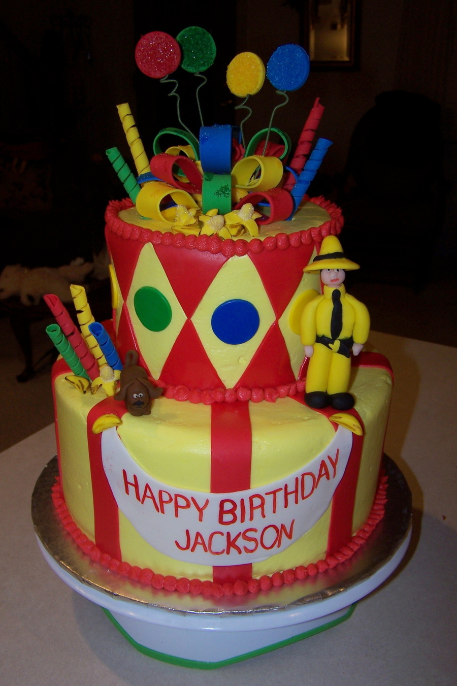 A Curious George themed cake. Whit cake with a sugar cookie middle, iced with vanilla butter cream and decorated with fondant/gum paste. Everything is hand made. The customer had a George topper that she put on it at the party.