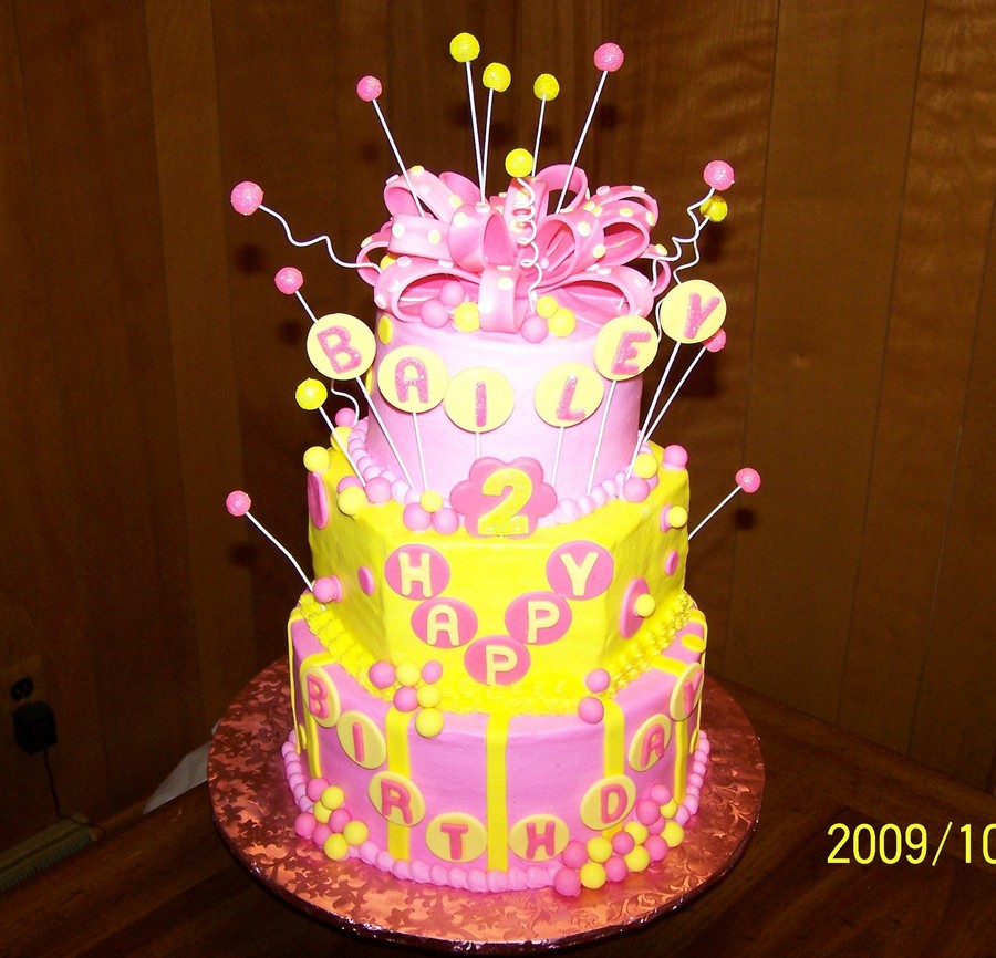 Done in buttercream with fondant balls. Balls were dusted with Disco dust. Bailey loves balls, pink and yellow and that is what she got.