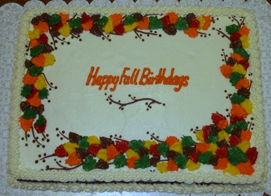 I did this one for the gals at work with fall birthdays. Classic white cake with buttercream icing and fall colored leaves.
