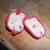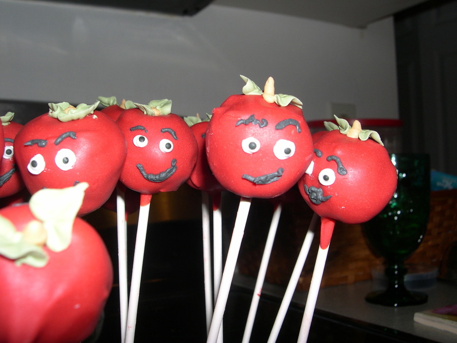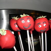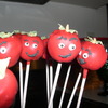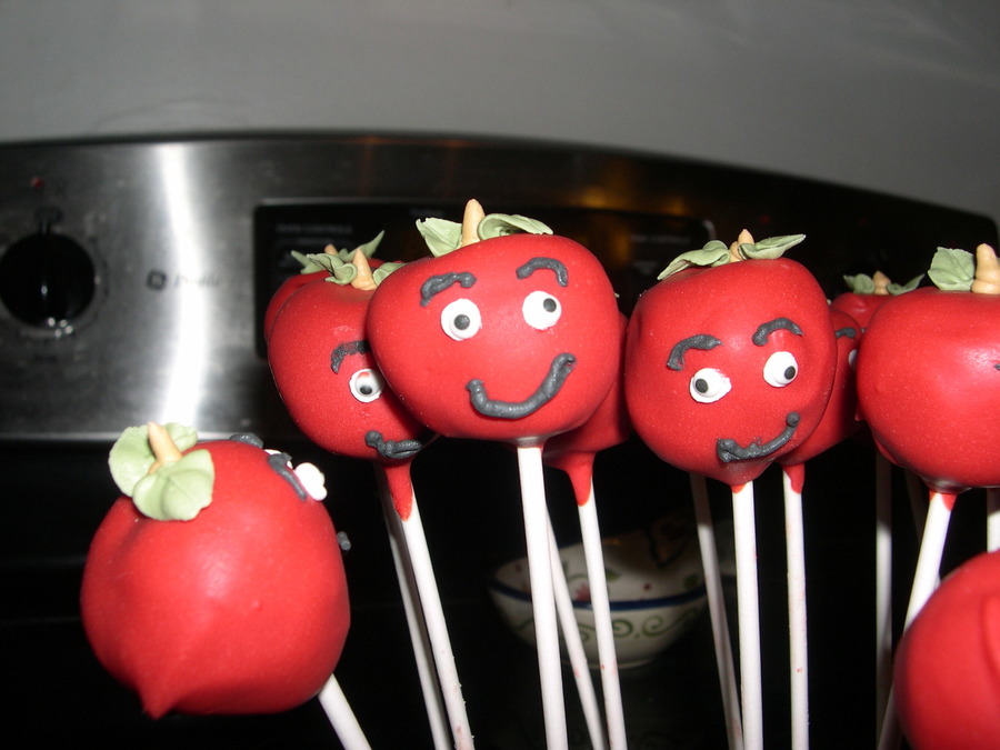 First attempt at cake pops - made my first cake balls earlier in the week. These were WASC with cream cheese frostng, Added a few mini choc chips for seeds - although didn't come out well in the picture, the popsicle stick moved them out of place. Dipped in red candy melts, royal icing decorations. Need more practice wth piping, but everyone at the party flipped over them! Based on Bakerella's cake pops. Tried pretzels for stems, but with the stick, it caused the ball to slide down the stick!!! Thanks to the cc'ers who helped me with these!