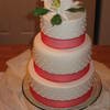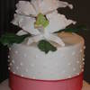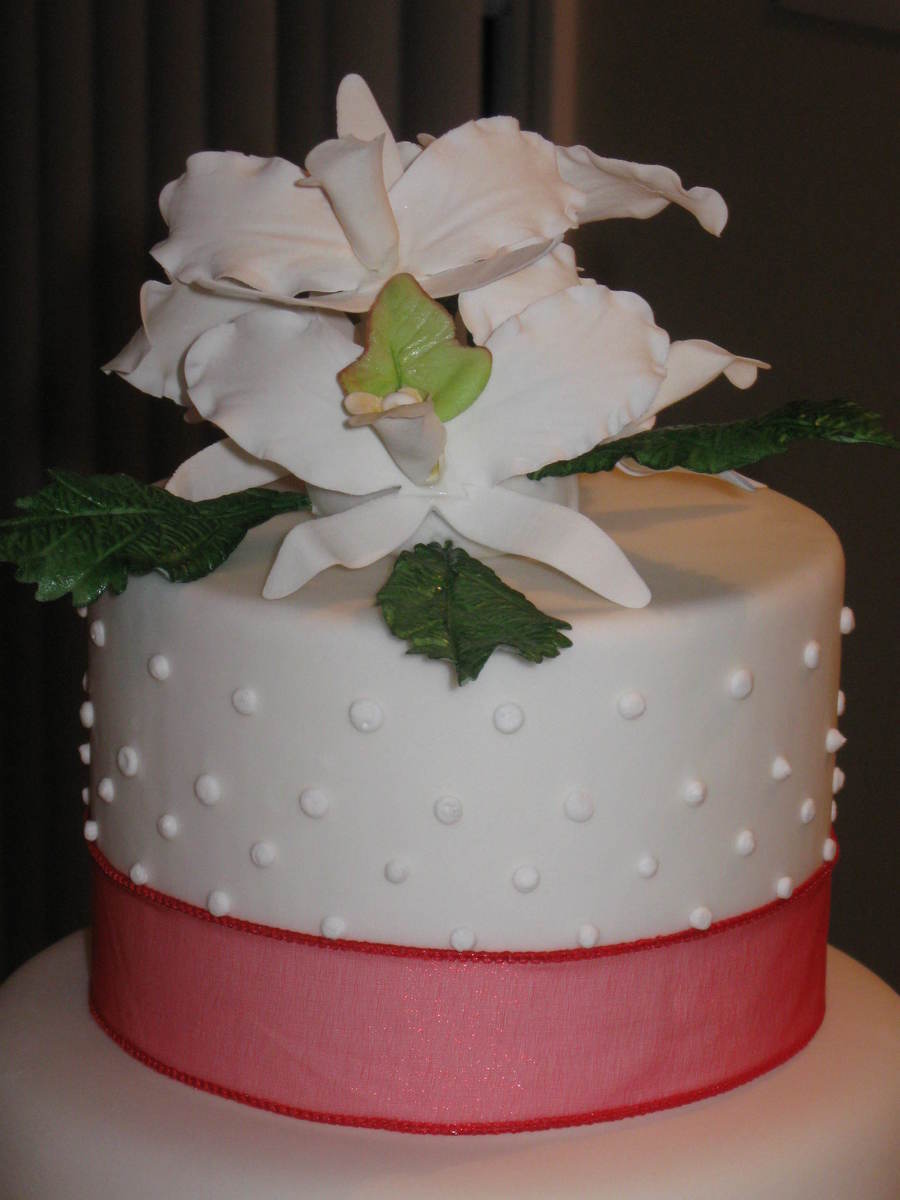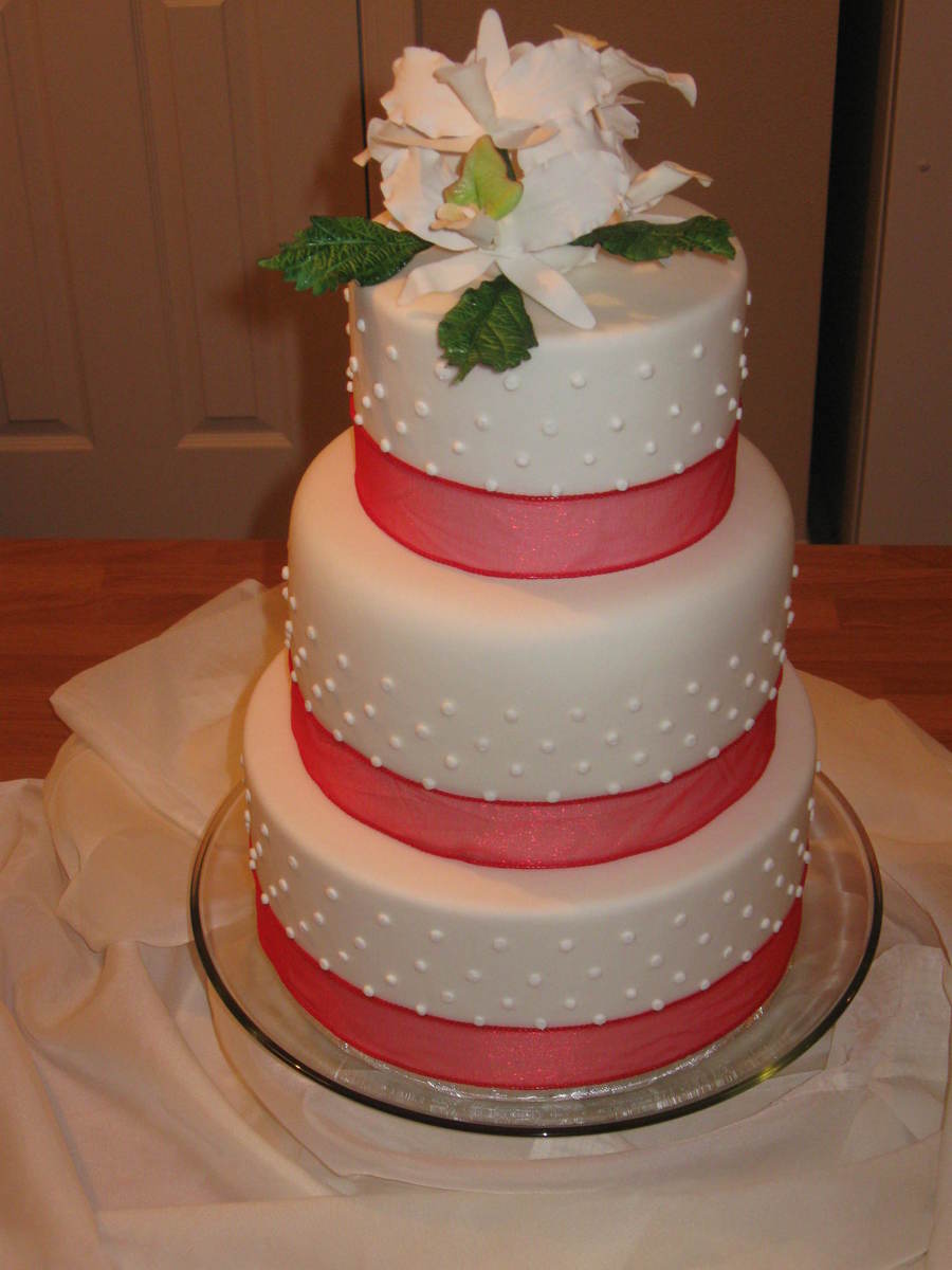 This is the wedding cake I made for this weekend. It was a three tier cake (6, 8 and 10 inch). The top and bottom tier are dummies while the middle tier is red velvet cake with cream cheese icing. The bride provided me with the ribbon and the stand. The flowers are just some I was making to try out orchids on my own-she was adding different flowers of her own on site. She was an absolutely wonderful bride. But I think I did undercharge! Oh well, it was a live and learn moment. I will post a pic with her flowers on it when she gets one to me! TFL!!!