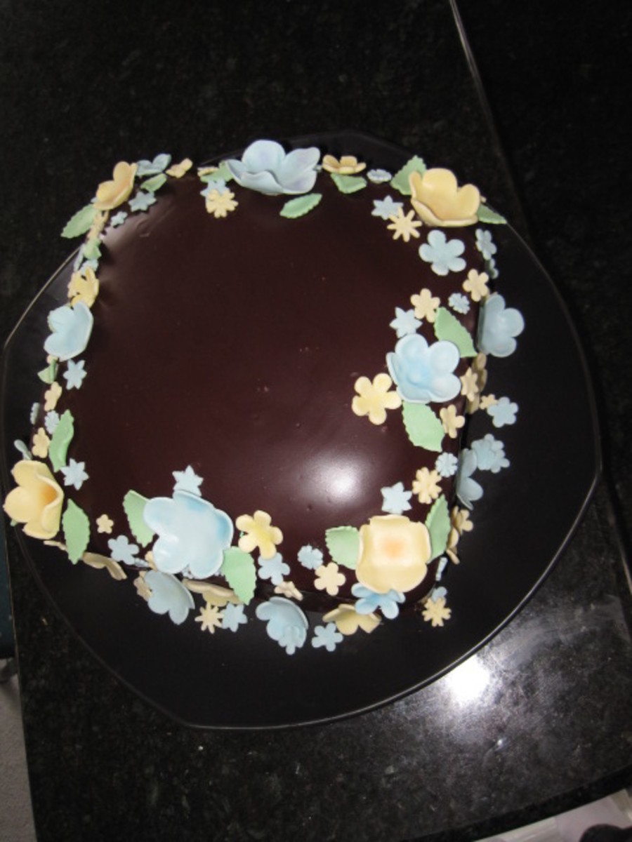 Chocolate cake, chocolate almond filling, and ganache covering. Flowers are a gumpaste fondant mix.