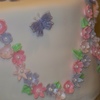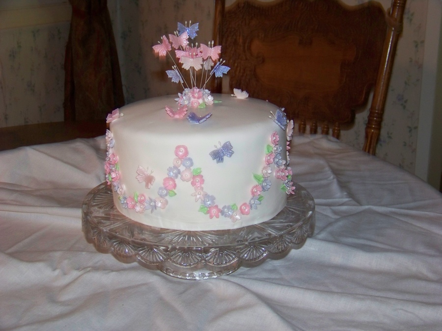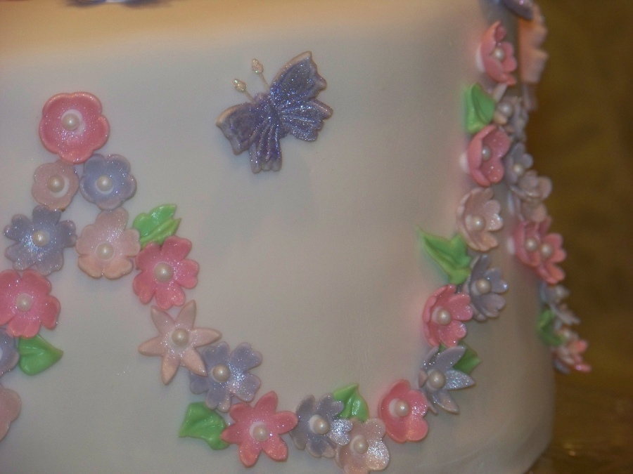 White fondant covered cake with pink and lavender flowers and butterflies formed from gum paste