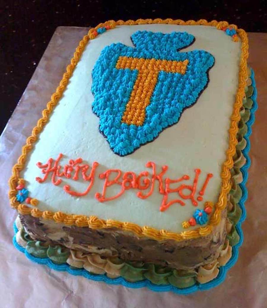 Made for a party to honor one of my husband's best friends. Ed is a master sergeant in the Texas National Guard and is being deployed to Iraq for a year. He and his family are very special people. The cake is my most requested, red velvet with cream cheese icing filled with layers of fresh sliced strawberries and fudge filling. It's decorated with the "T Patch," a blue arrowhead insignia of Ed's brigade. The sides of the cake are decorated to simulate desert camoflage. I love the name of this particular pattern - cookie dough!