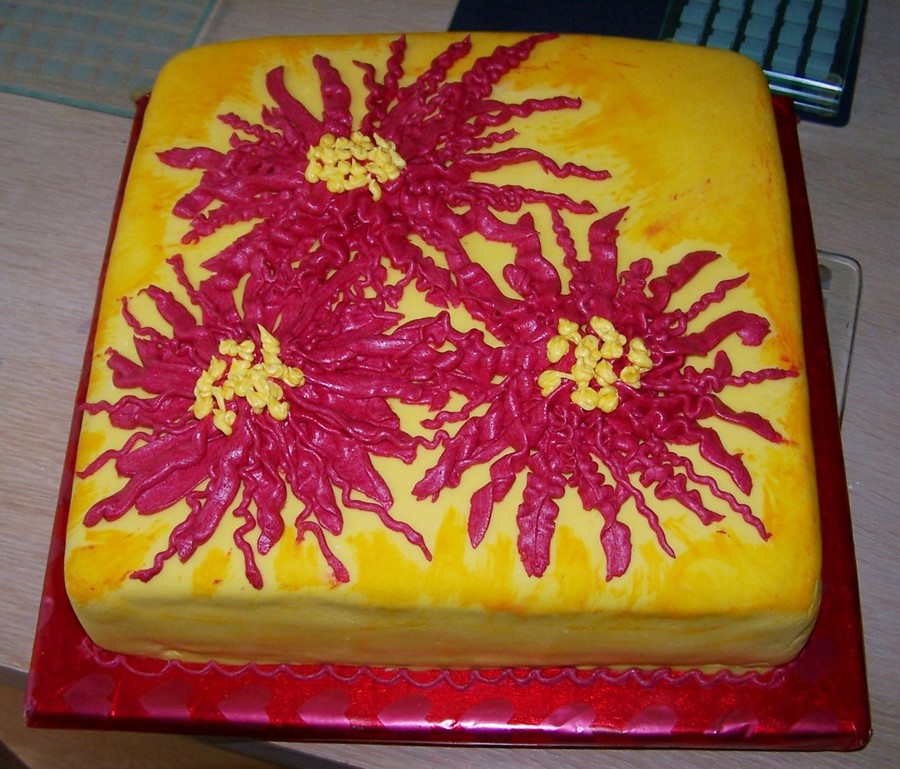 vanila sponge, covered in yellow handpainted fondant, piped with fushia flowers