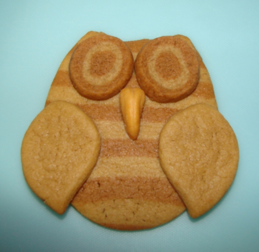 I was tired of iced cookies, but I still wanted to do a cute design, so Icame up with this idea. This owl is a brown-sugar refrigerator cookie, with a cashew beak and maple buttercream (holding the eyes, wings, and beak in place). I got the owl shape by using an egg-shaped cutter and then using a small circle cutter to remove some dough from the top of the egg. Used a leaf cutter for the wings. Eyes were just slice-and-bake. Used brown food coloring on half the dough to get the two-tone effects.
