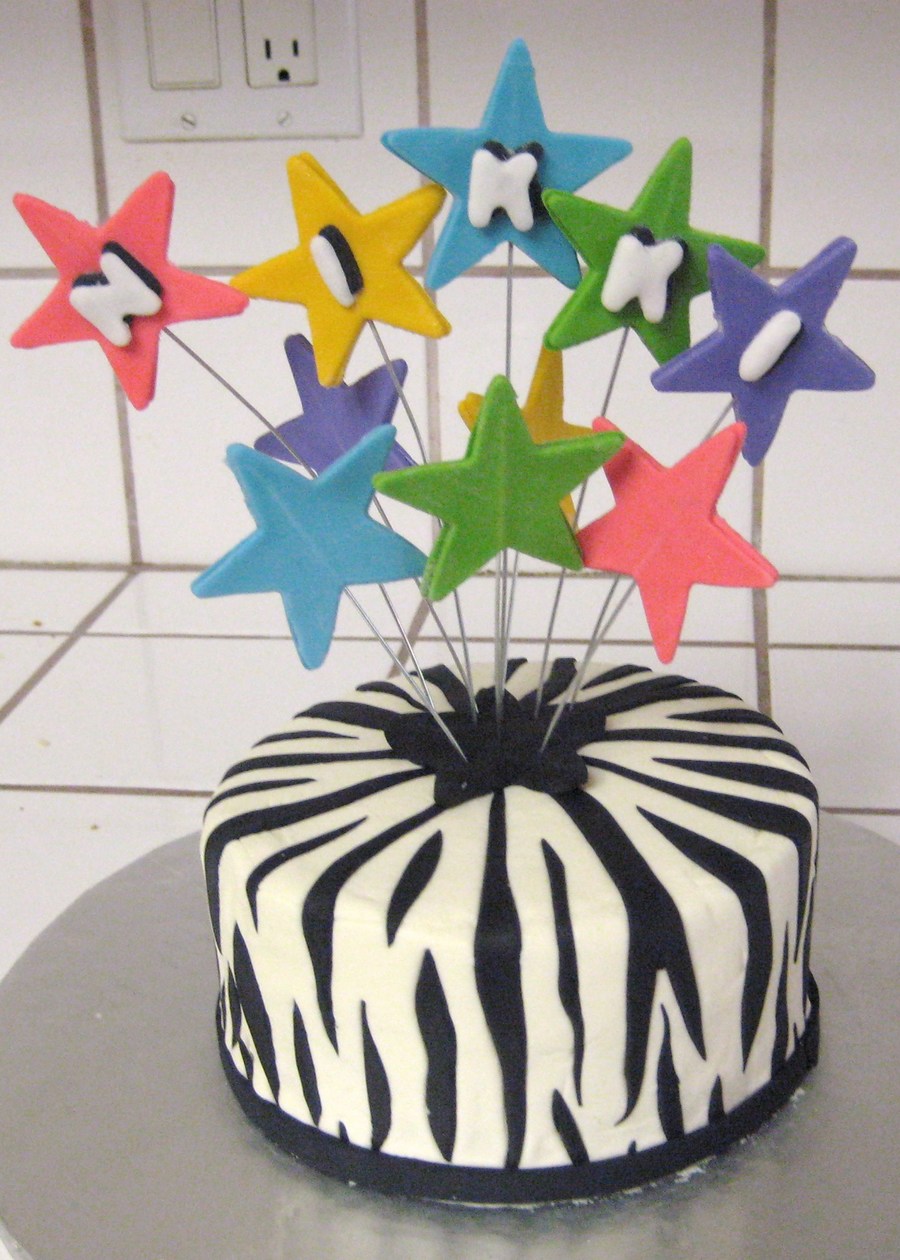 My first attempt at a zebra cake...used my friends bday as an excuse to finally make one. This is buttercream with fondant stripes...and she loves stars and bright colors...thanks for looking