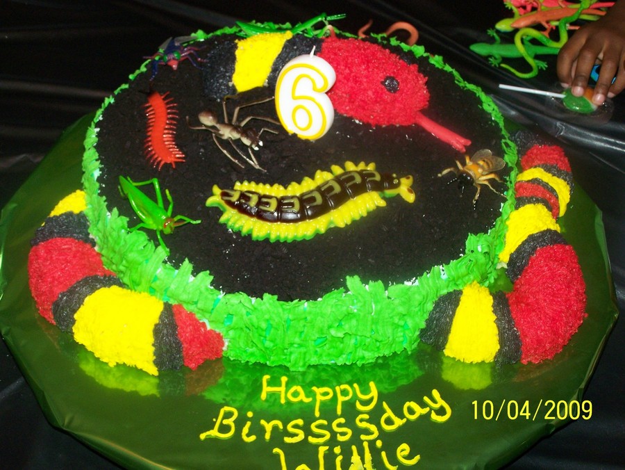 My nephew is into Snakes and Bugs. Got my inspiration from this site. It is a Dominican Cake with Dominican Merengue. Oreo cookie crumbs for dirt. The snake I molded with rice crispies treat recipe. Wilton Icing recipe used for Snake and grass decorations.