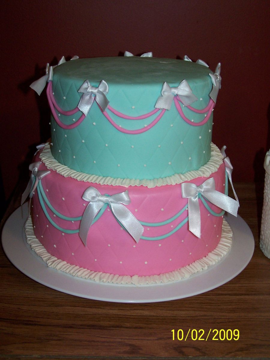 I totally copied someone else's picture and changed a few things on this cake. I used mmf on this whole cake. I covered styrafoam pieces for the castle itself. I let them dry for a few days, (should have used gumpaste! live and learn). I used royal icing for the flowers on the castle and for attaching ribbon bows. I used a diamon impression mat on the cake and a cobblestone impression clay mat for the castle.