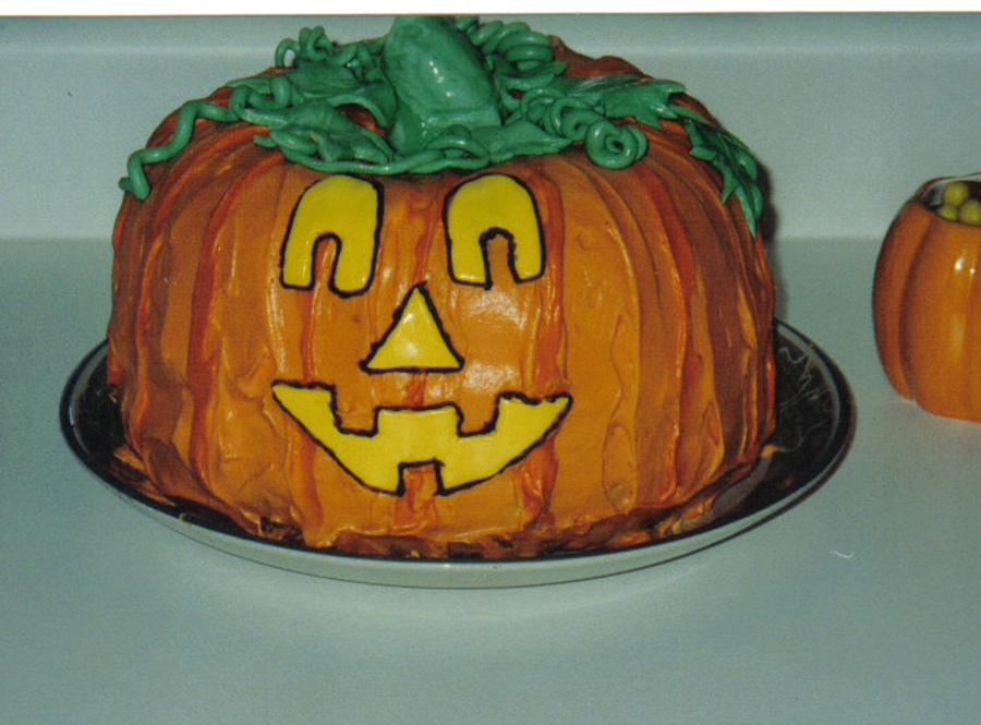 This is pumkin cake with cream cheese frosting. It's made in 2 bunt cake pans stackes on top of eatch other one up-side down the other right-side up. the face and top are fondant
