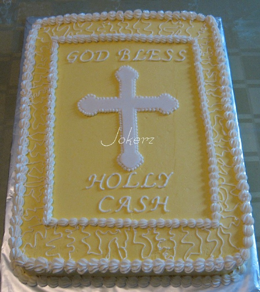 This is my first order. It is for the baptism of a friend's two children. 1/2 sheet chocolate chip cookie cake with vanilla SMBC and an MMF cross. I based my design on a cake by Michele25.