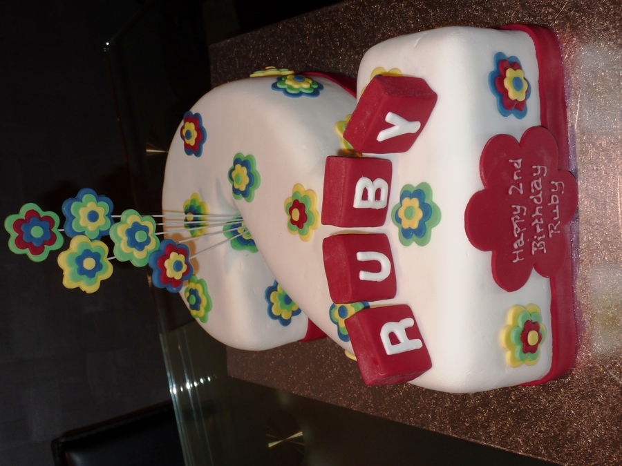 Caramel mud iced with fondant, fondant flowers and blocks.