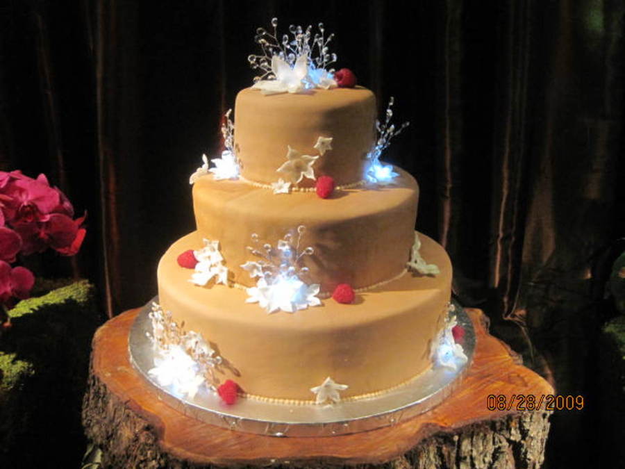 white cake with pineapple-appricot filling, covered in fondant, white fondant flowers, glass beads with little lites to make the cake glow!!!! along with some raspberries!!! this cake was really pretty...not my style for a wedding but pretty just the same!!!