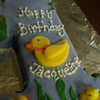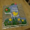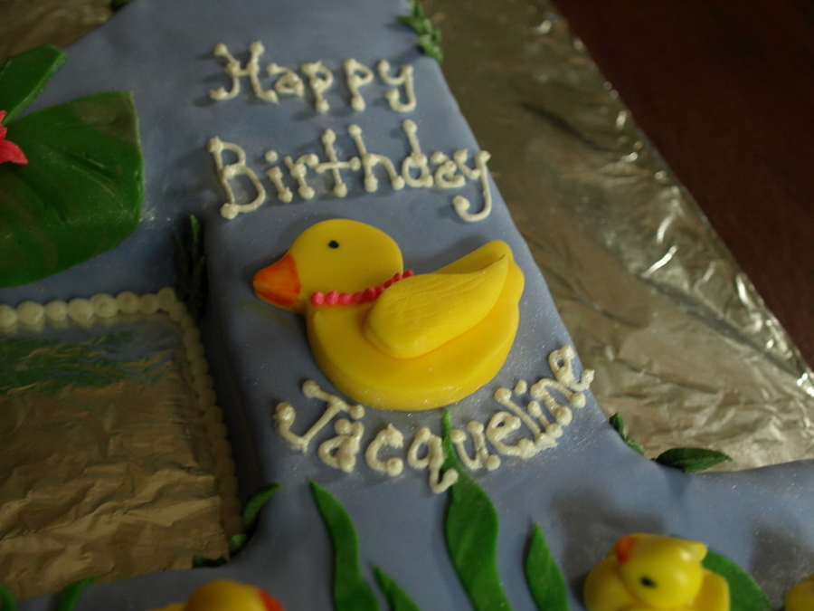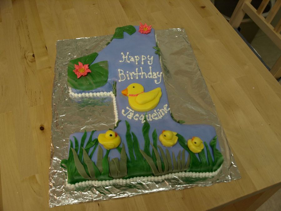 I made this cake for my friend's daughter's 1st birthday. She had a duck theme going on. It is a chocolate cake with buttercream filling and icing and covered in fondant. All the details on the cake are fondant.