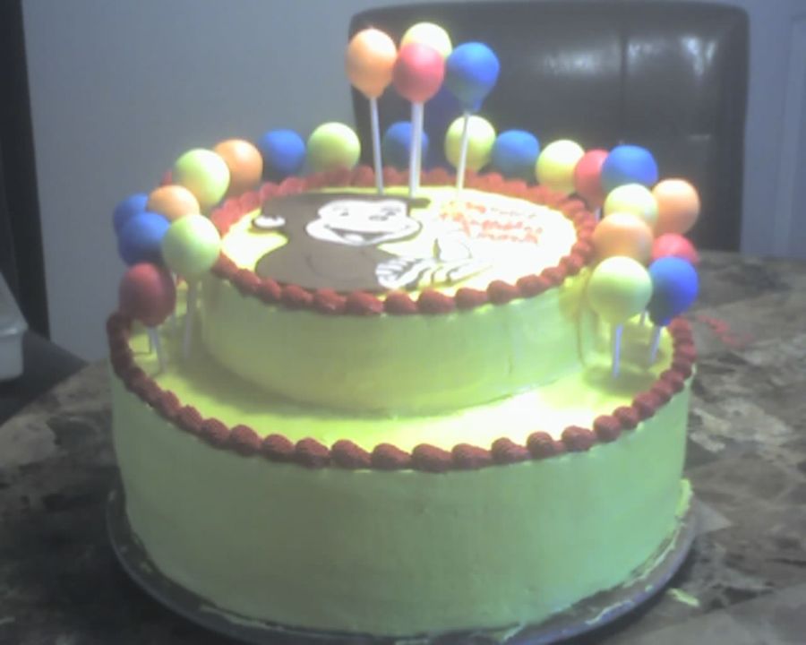 cake frosted with bc. Made balloons with fondant. Made curious georrge out of chocolate.