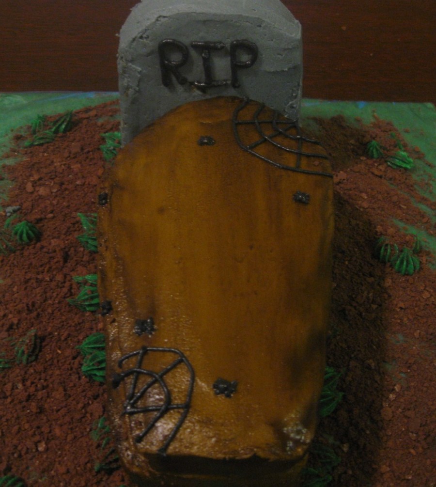 This one is spice cake with all buttercream. I frosted the coffin with brown, then diluted some brown food coloring with clear liquer and painted the wood grain look. It was fun!