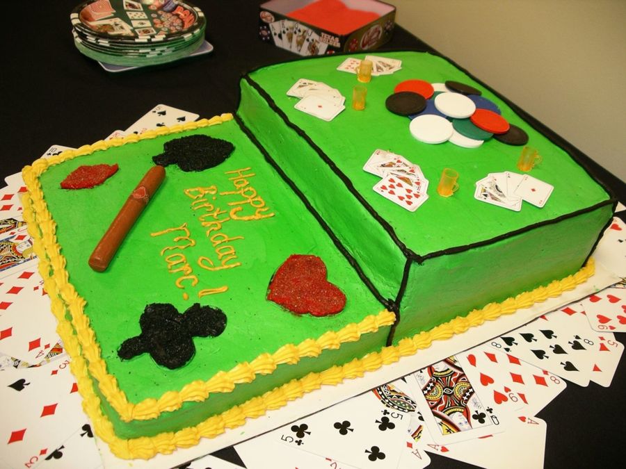 Not my best work, but it was still a hit! Two cakes were made....one 12x18 and one 9x13 to sit on top. The four suits on the bottom half were imprinted from cookie cutters, frosted with their respective color, and then topped with colored sugar, while the cookie cutter was still on the cake. I would recommend outlining the shapes with a Tip 2 or 3. I admit I cheated with the other accessories as they are all non-edible, but many items could be created with chocolate and/or fondant.
